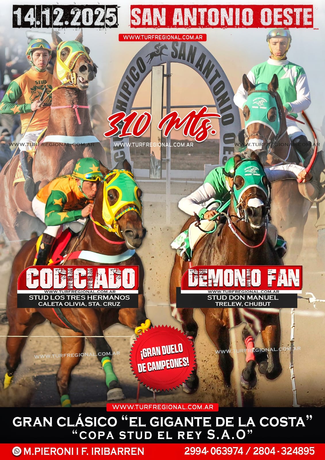 El Club Hípico San Antonio Oeste se prepara para vivir una gran jornada a puro turf el próximo domingo 14 de diciembre. Como atractivo principal ya se encuentra confirmado el Gran Clásico El Gigante de la Costa, Copa Stud El Rey” sobre los 310 Mts. en donde se enfrentarán dos Campeones en busca del podio: 🏆DEMONIO FAN (Stud Don Manuel – Trelew) vs. 🏆CODICIADO (Stud Los 3 Hermanos- Caleta Olivia).
