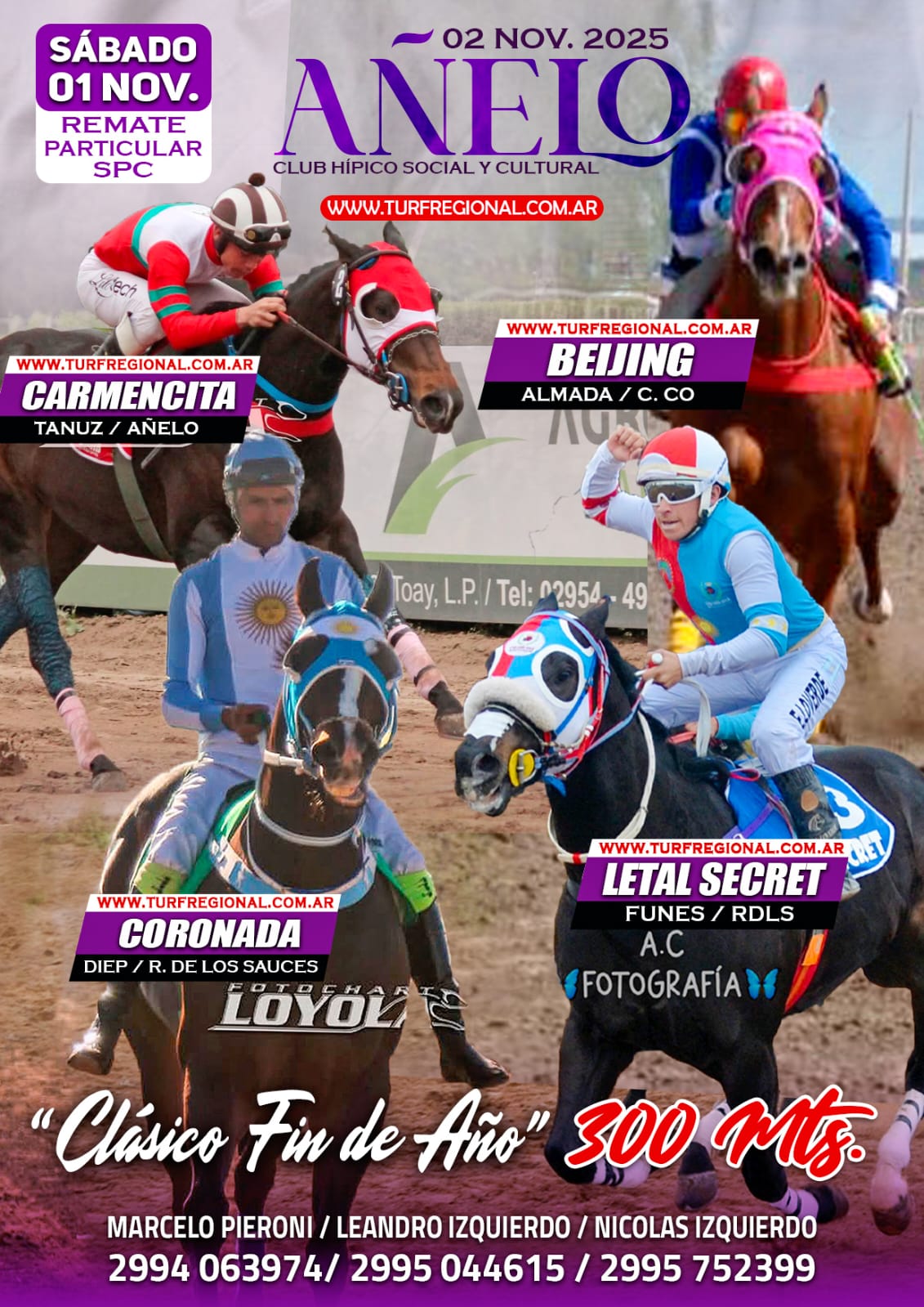 El próximo domingo 2 de noviembre se llevará a cabo la jornada de turf que marcará el final de la temporada 2025 en el Club Hípico Social y Cultural Añelo. La organización está a cargo de Marcelo Pieroni, Leandro y Nicolas Izquierdo, con varios adelantos confirmados. CONTACTO: 2994-063974 / 2995-044615 /2995752399.