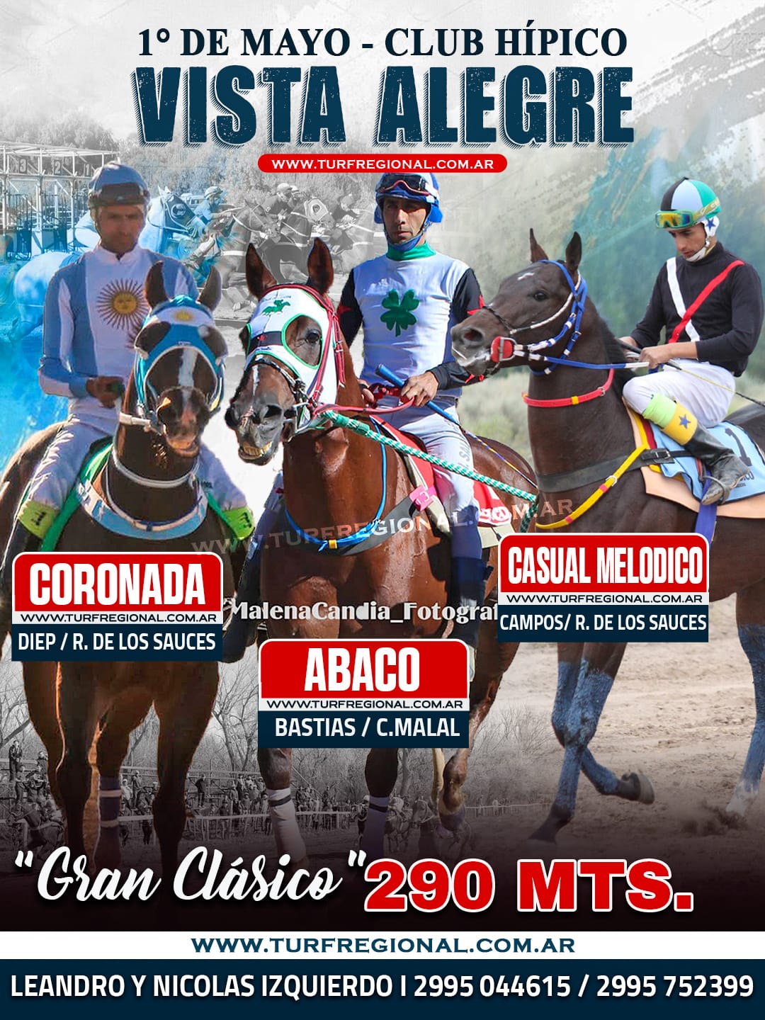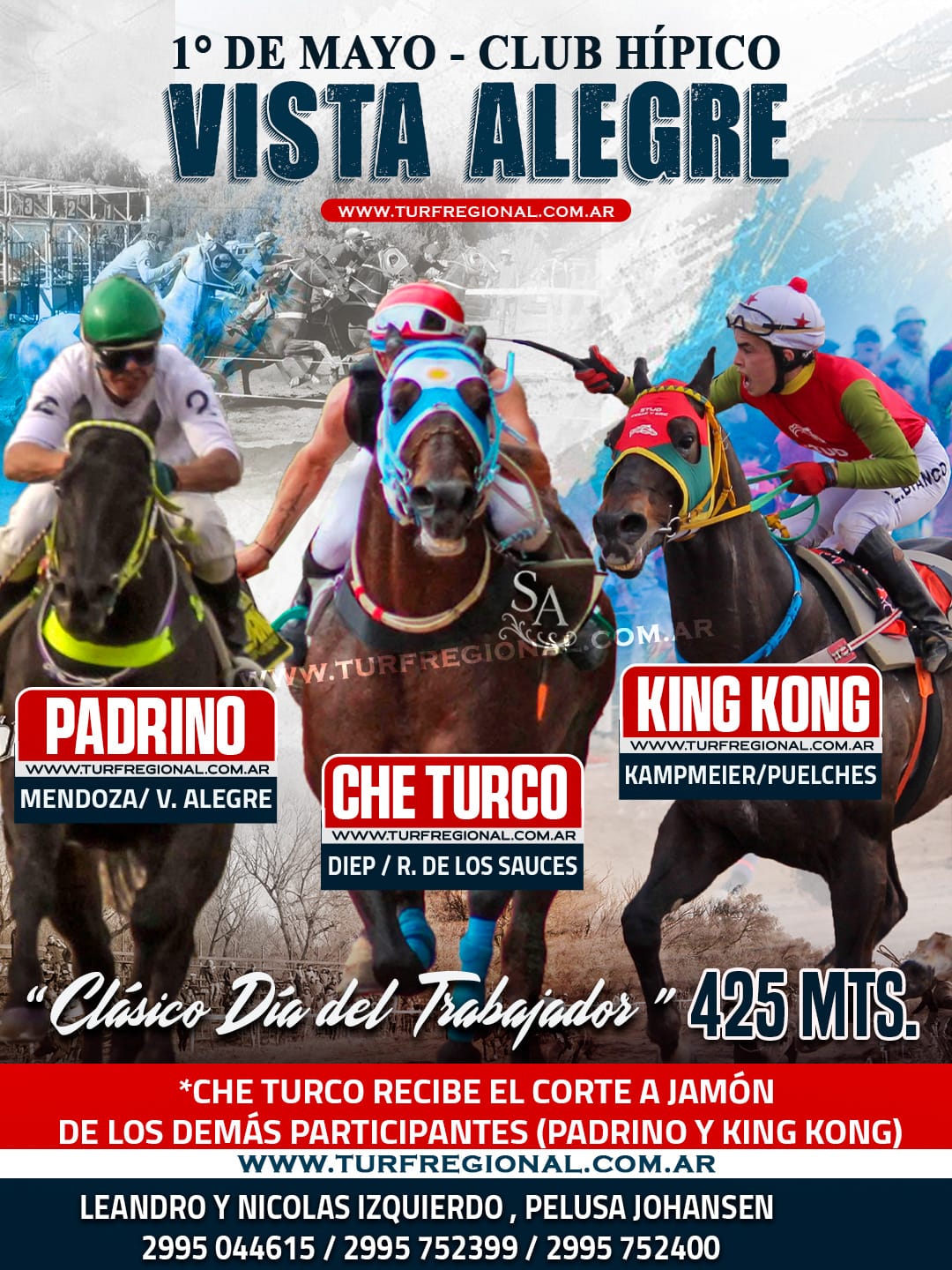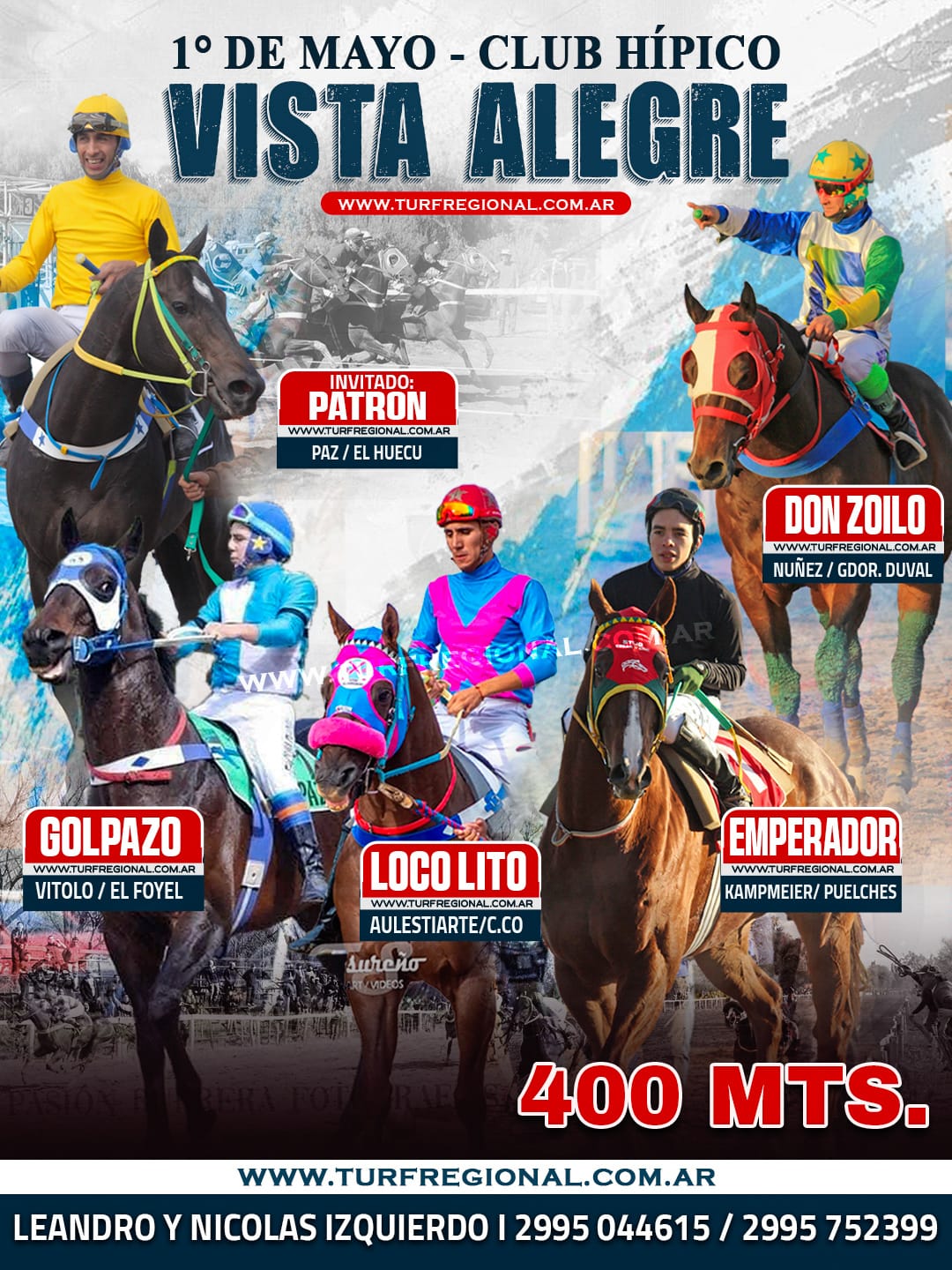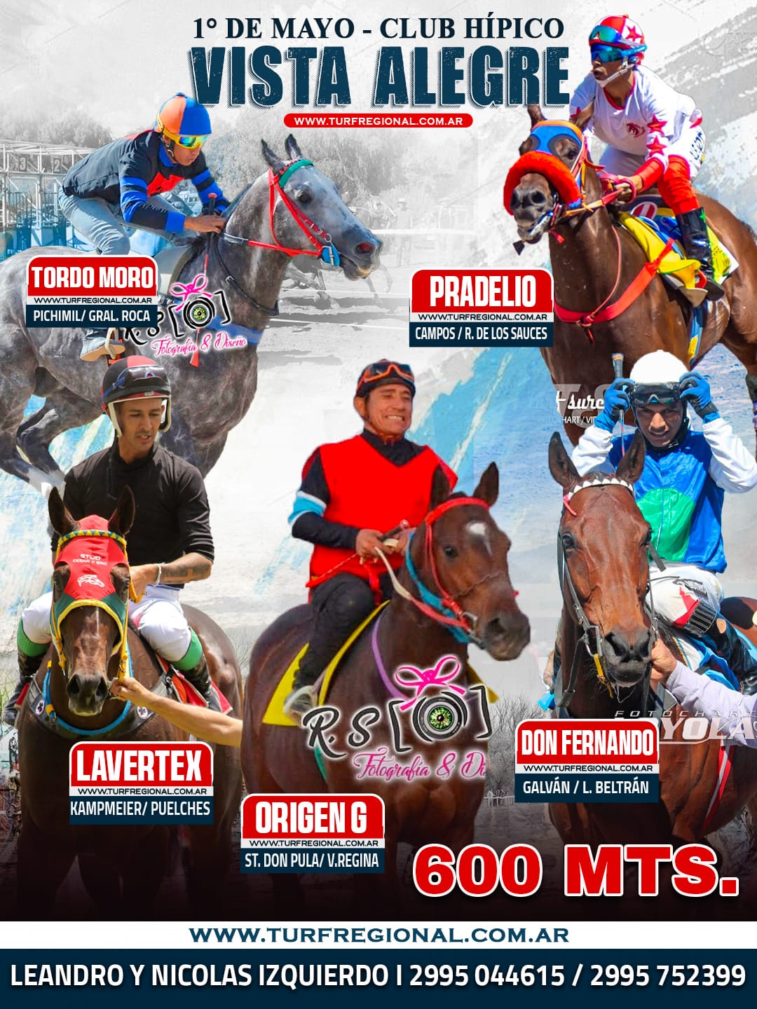 El viernes 1 de mayo se corre nuevamente en la mítica recta del Club Hípico Riveras Nequinas Vista Alegre. Bajo la organización de Leandro Izquierdo, Nicolas Izquierdo y Pelusa Johansen la jornada ya cuenta con varios adelantos, entre ellos el Clásico Día del Trabajador en donde se enfrentan King Kong, Che Turco y Padrino. CONTACTO: 2995-044615 /2995752399 / 2995752400