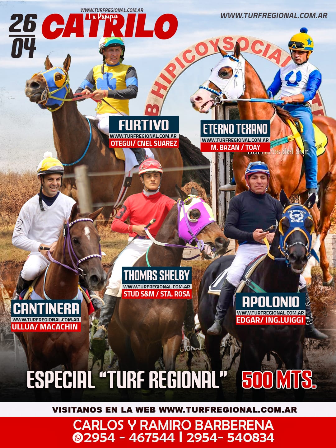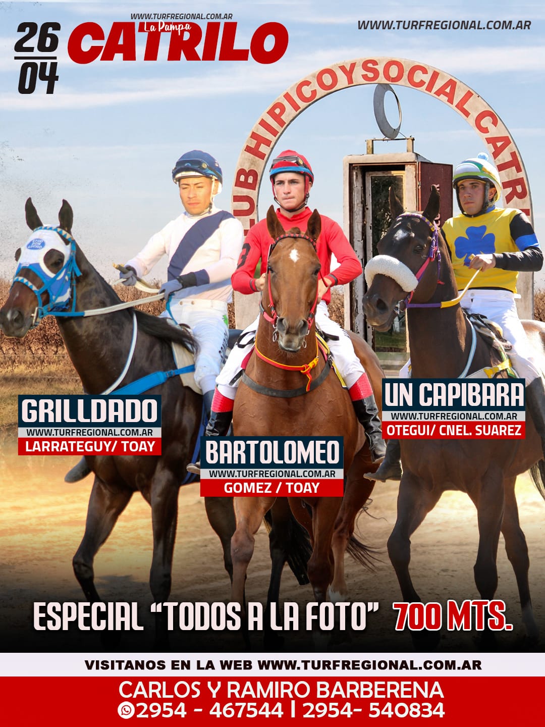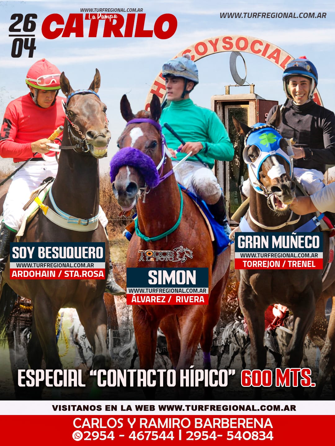 Con la organización de Carlos y Ramiro Barberena se corre este domingo 26 de abril en el Club Hípico y Social CATRILO, provincia de La Pampa. La jornada ya cuenta con tres pruebas centrales: Especial “Turf Regional”, Especial “Contacto Hípico” y Especial “Todos a la Foto”. CONTACTO: 2954 – 467544 I 2954- 540834