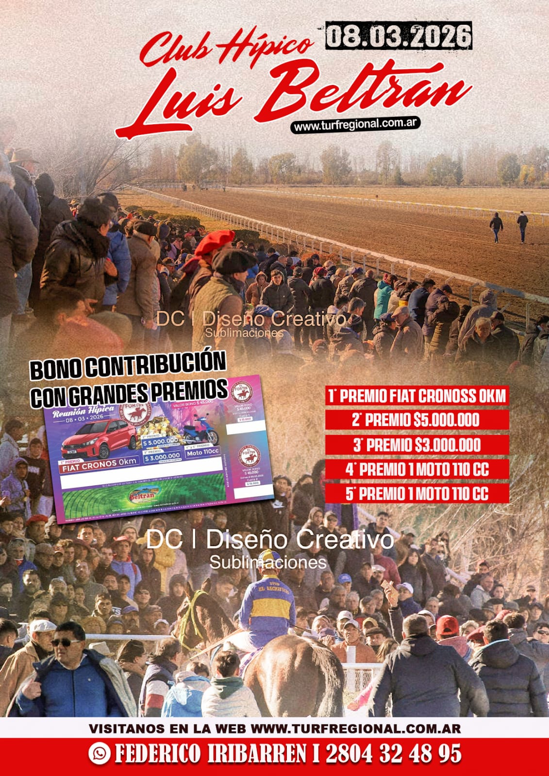 La primer jornada de turf del Club Hípico “El Fortín” de Luis Beltrán, provincia de Río Negro será el domingo 8 de Marzo. Con la entrada participas de importantes Premios. La organización a cargo de Federico Iribarren. CONTACTO: 2804 – 324895