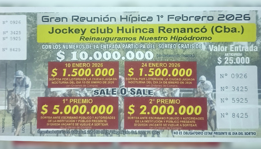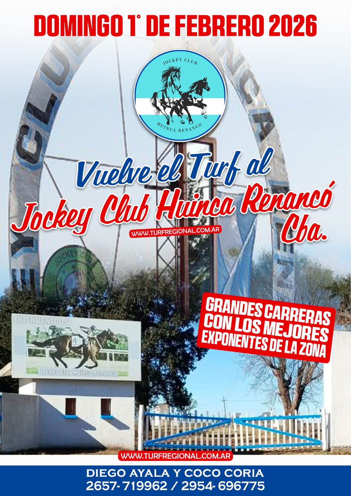 El próximo domingo 1 de febrero vuelve a abrir sus puertas el Jockey Club HUINCA RENANCÓ, provincia de Cordoba. La dupla Diego Ayala – Coco Coria buscará reunir los mejores exponentes de la zona para darle vida nuevamente a la actividad. Se encuentra a la venta el Bono (que también servirá como entrada) con importantes premios. CONTACTO: 2657- 719962 / 2954- 696775