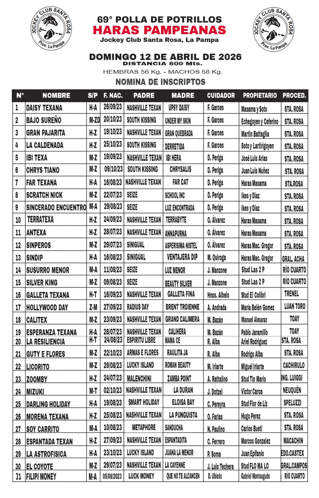El domingo 12 de Abril se disputará la tradicional Polla de Potrillos HARAS PAMPEANAS. La competencia reservada a los hijos de los padrillos afincados en la provincia de La Pampa va por su edición 69, sin lugar a dudas el meeting más tradicional en las tierras del turf regional. Además, se disputará la Polla de Potrillos “Haras Libres.” En la organización Federico Ferrer y Alejandro Leguizamon. CONTACTO: 2302- 535892 I 2954 – 745420