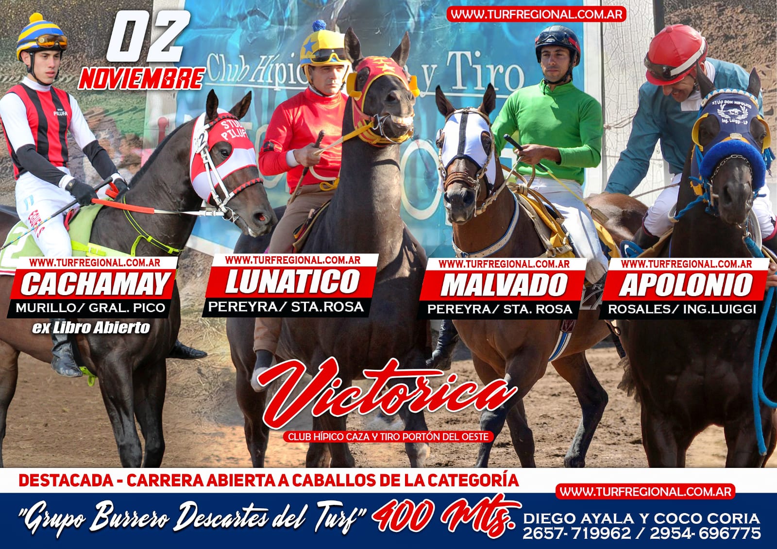 Este domingo 2 de noviembre vuelve el turf al oeste pampeano. Con la organización a cargo de Diego Ayala y Coco Coria el Club Hípico “Caza y Tiro Portón del Oeste” Victorica te invita a ser parte de una gran jornada de turf, con la entrada participas de en Premios. Aquí los adelantos. CONTACTO: 2657- 719962 / 2954- 696775