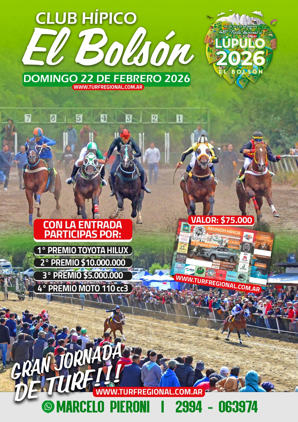 En el marco de la Fiesta Nacional del Lúpulo el Club Hípico EL BOLSÓN se prepara para una nueva gran jornada de turf con los mejores exponentes de la zona. Ya está a la venta el Bono (que servirá como entrada) a un valor de $75.000. Organiza Marcelo Pieroni. CONTACTO: 2994 – 063974