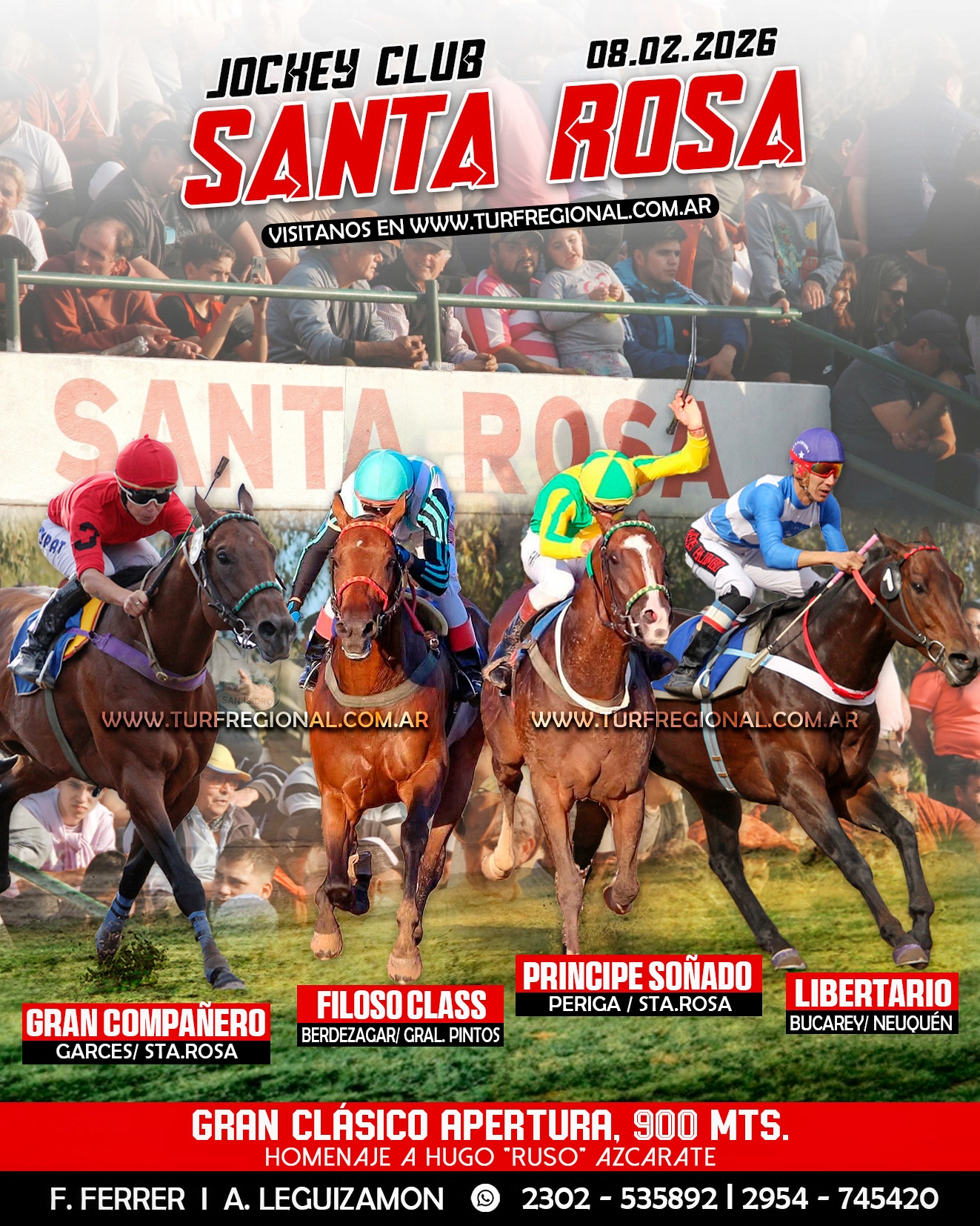 El hipódromo de la capital pampeana dará comienzo a su temporada 2026 el domingo 8 de febrero. La organización está confiada a Alejandro Leguizamon y Federico Ferrer, con un clásico confirmado sobre los 900 metros en donde se enfrentarán: Gran Compañero (Garces/ Sta. Rosa), Principe Soñado (Periga/ Sta. Rosa), Filoso Class (Berdezagar/ Gral. Pintos) y Libertario (Bucarey/ Neuquén). CONTACTO: 2302- 535892 I 2954 – 745420