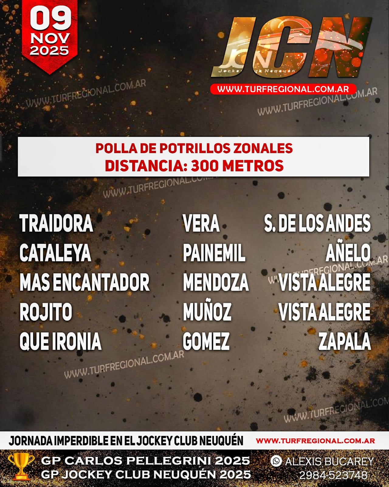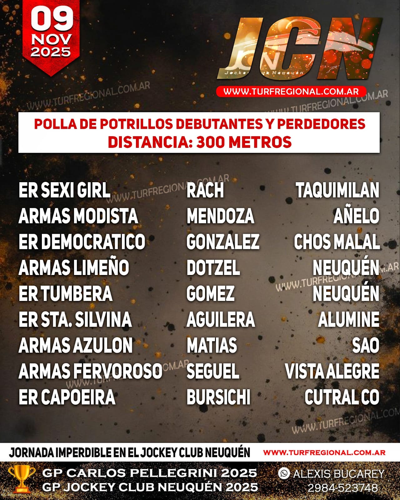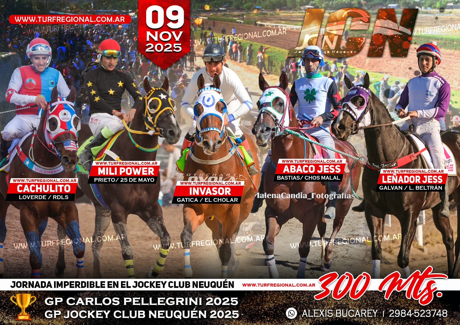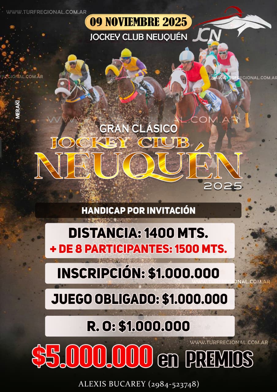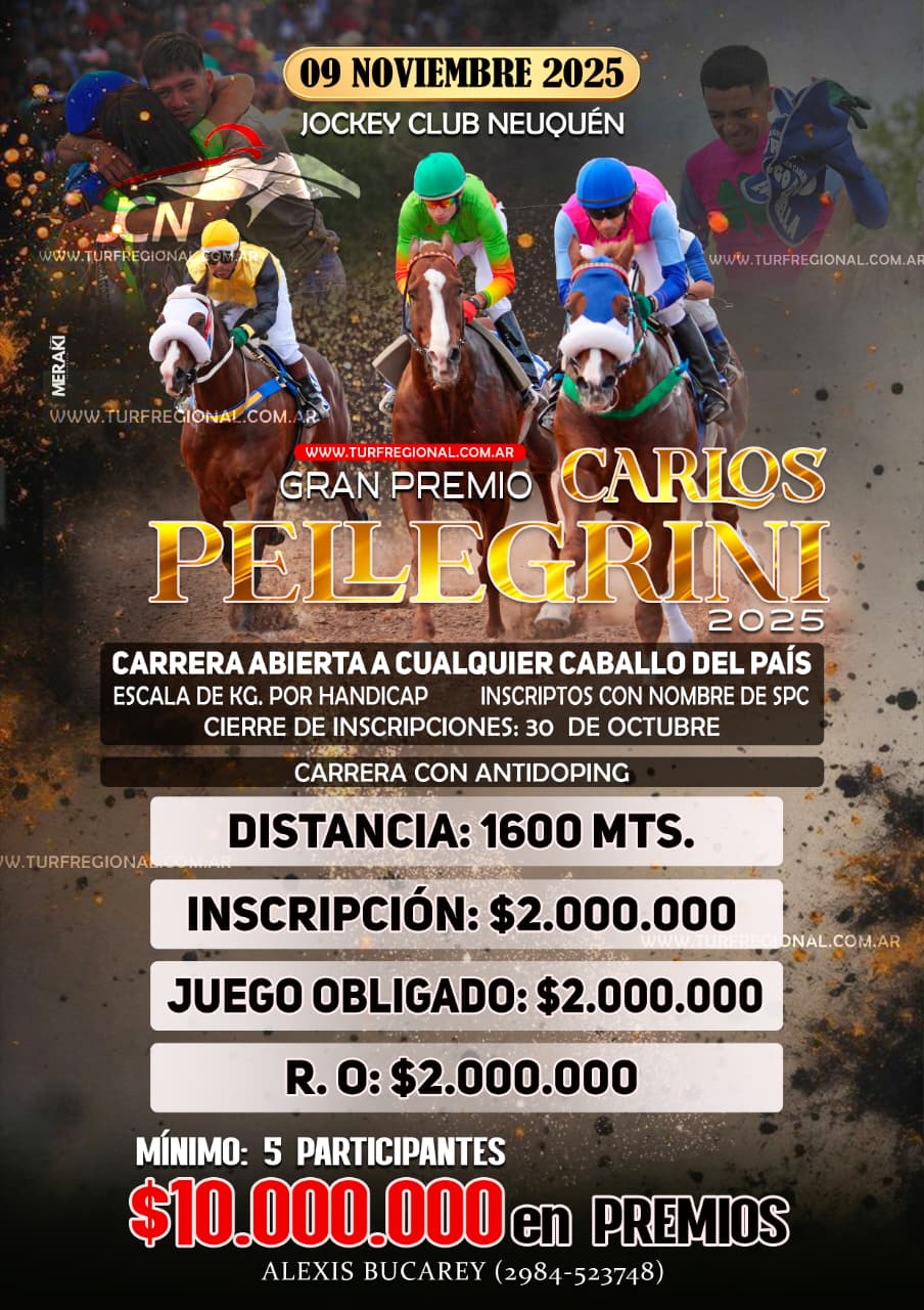 El Jockey Club Neuquén anuncia el Gran Premio Carlos Pellegrini, a disputarse sobre los 1600 metros de recorrido el día 9 de noviembre. La clásica prueba patagónica tendrá $10.000.000 en Bolsa de premios (MÍNIMO 5 PARTICIPANTES), será con la modalidad hándicap por invitación, y promete reunir a los mejores especialistas en la milla. Otra destacada de la jornada será el tradicional Clásico Jockey Club Neuquén sobre los 1400 metros. El cierre de inscripción es el jueves 30 de Octubre. En la organización Alexis Bucarey CONTACTO: 2984 – 523748