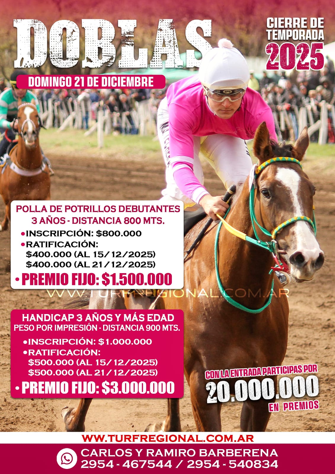 El domingo 21 de diciembre la Asoc. Civil DOBLAS Crece, provincia de La Pampa, dará cierre a la temporada 2025 con una gran jornada de turf. La libreta de anotaciones está a cargo de Carlos y Ramiro Barberena; con la entrada participas de $20.000.000 en Premios. CONTACTO: 2954 – 467544 / 2954 – 540834