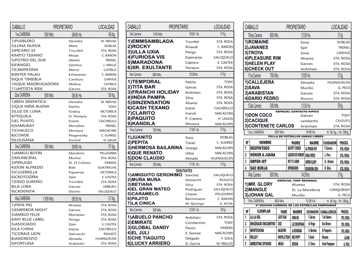 Este domingo 12 de Abril se disputará la 69° edición de la tradicional Polla de Potrillos HARAS PAMPEANAS. La competencia reservada a los hijos de los padrillos afincados en la provincia de La Pampa va por su edición 69, sin lugar a dudas el meeting más tradicional en las tierras del turf regional. Además, se disputará la Polla de Potrillos “Haras Libres”, la 5° Edición de la Carrera de las Estrellas y la Super Polla de Potrillos de HARAS MASAMA y varios especiales. Con la entrada participas de importantes premios. En la organización Federico Ferrer y Alejandro Leguizamon.