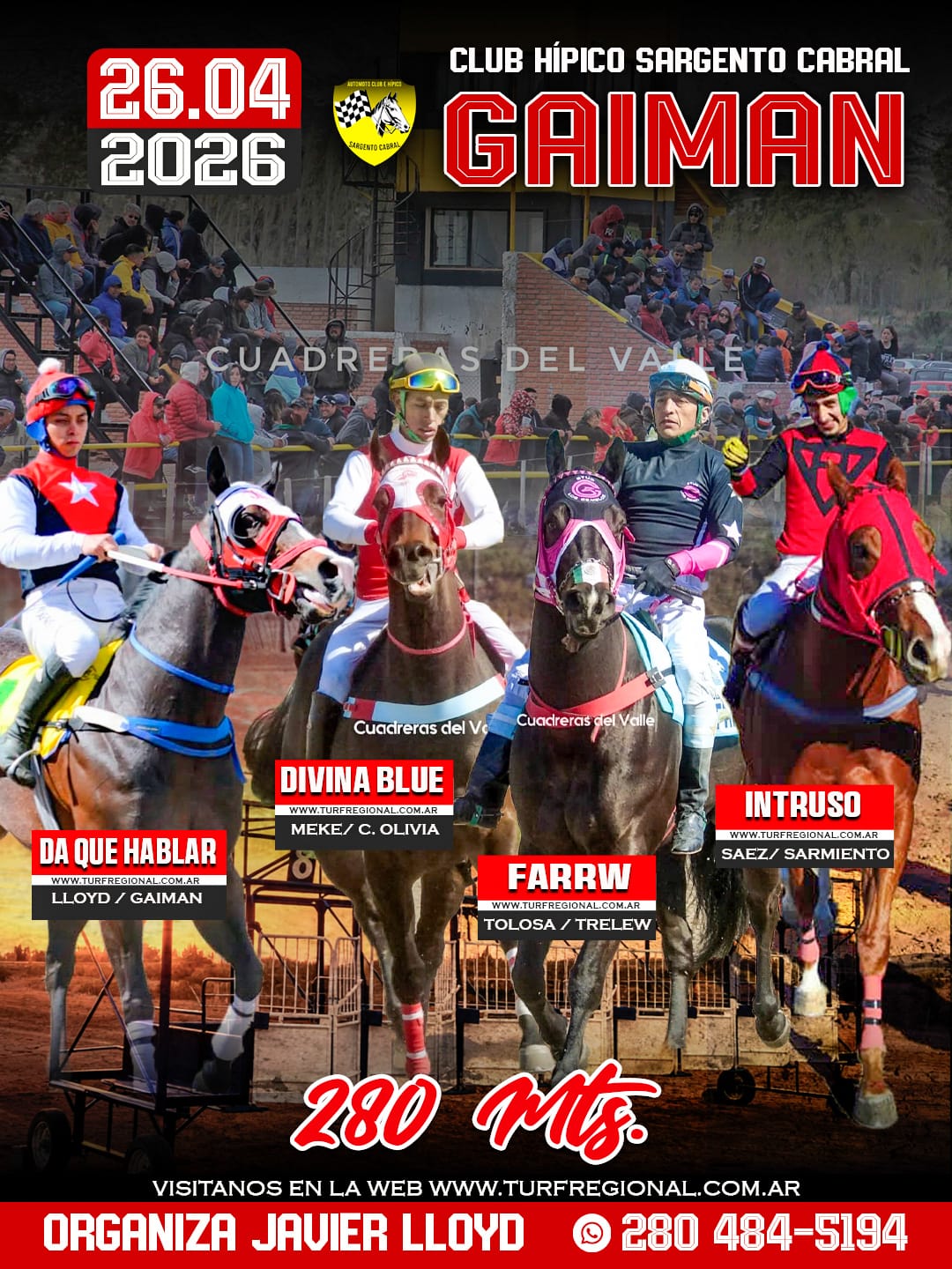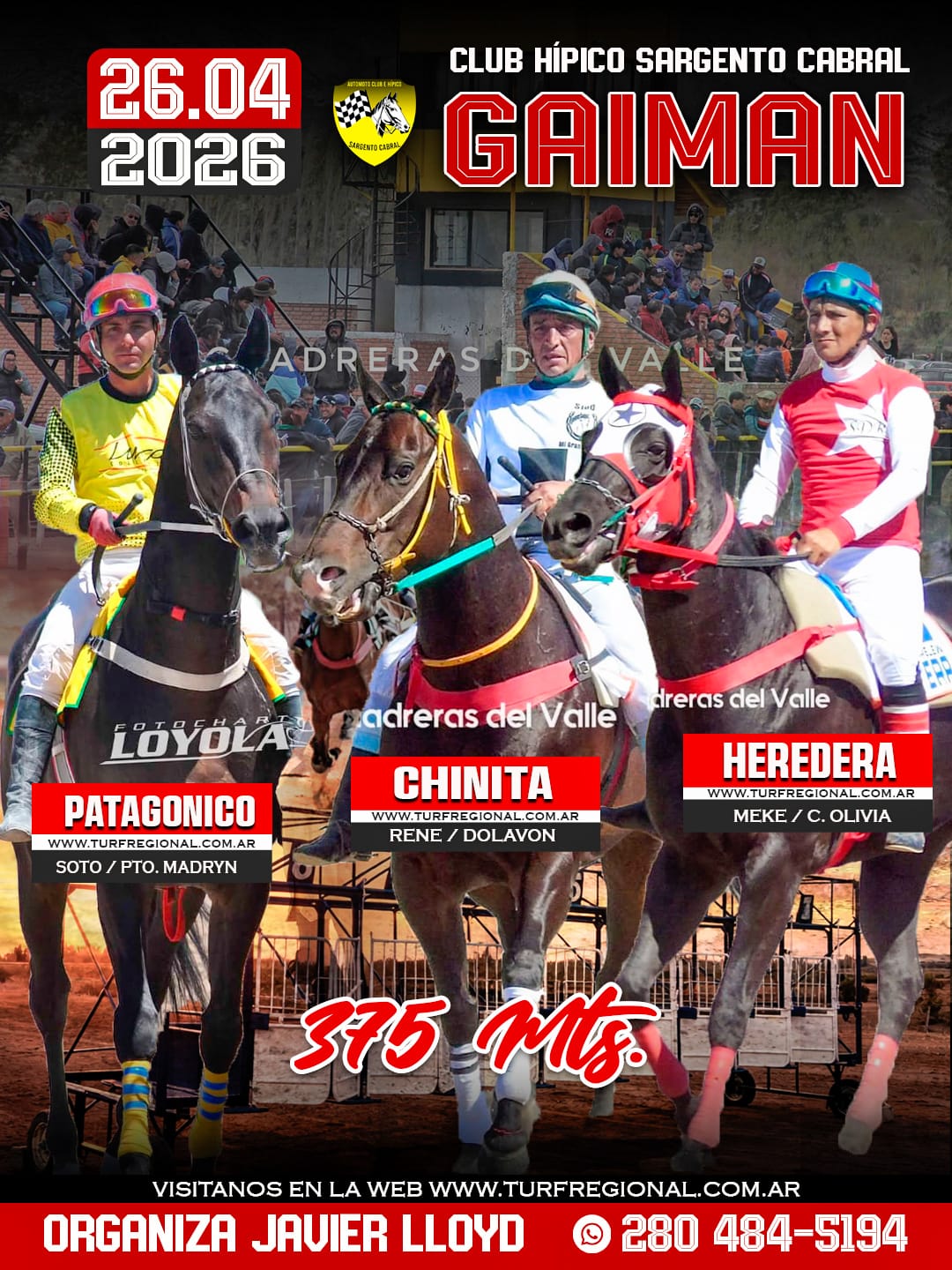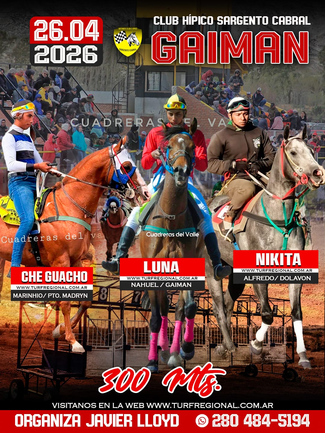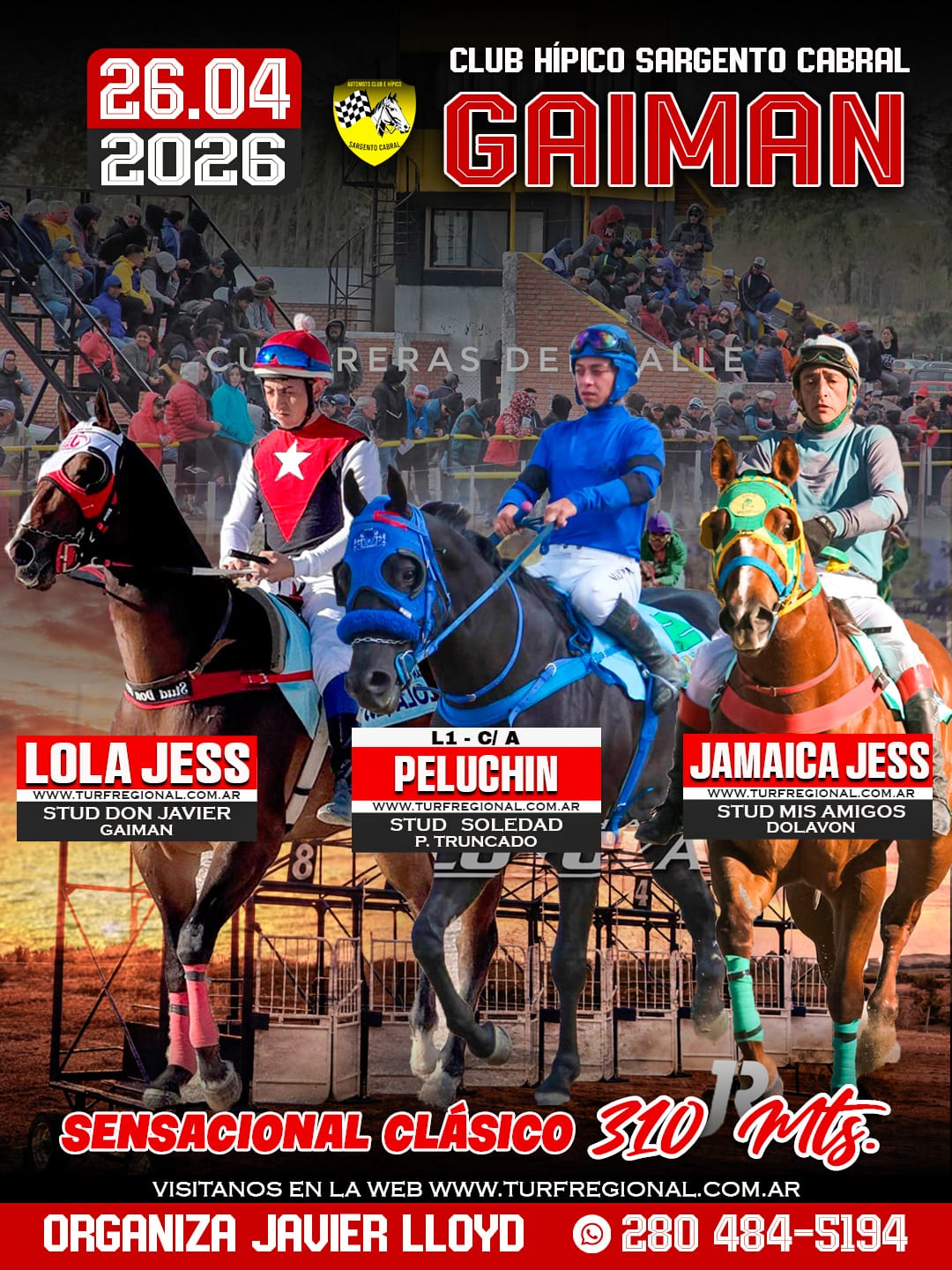 Todos los adelantos para la jornada de este domingo 26 de abril en el Club Hípico Sargento Cabral GAIMAN, provincia de Chubut. Un especial sobre los 310 metros en donde se enfrentarán Lola Jess, Peluchin y Jamaica Jess. En la organización Javier Lloyd. CONTACTO: 280 484-5194