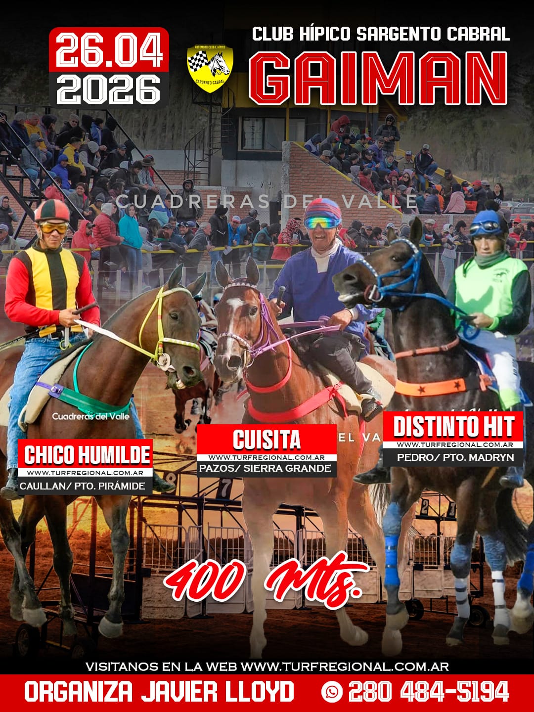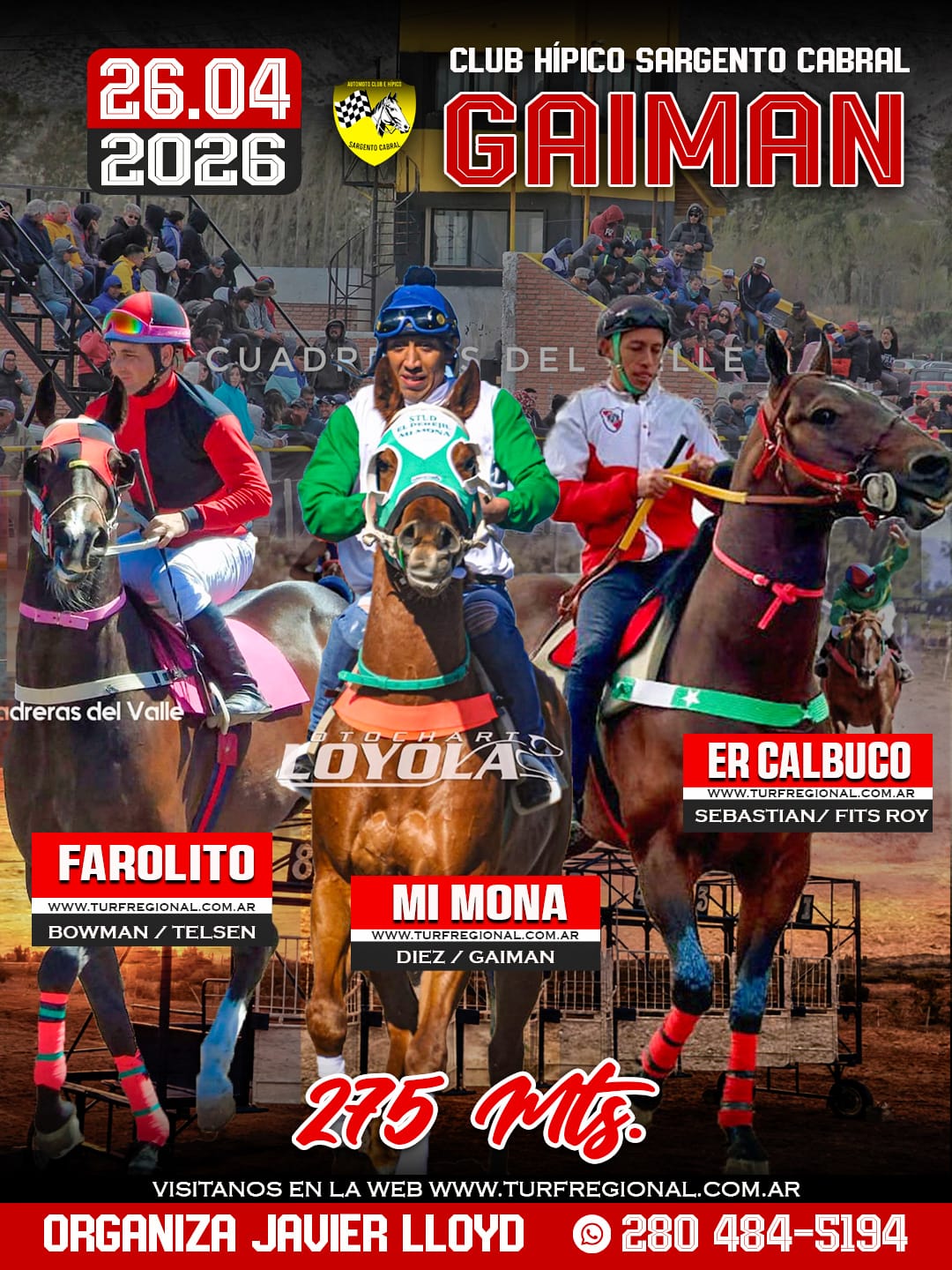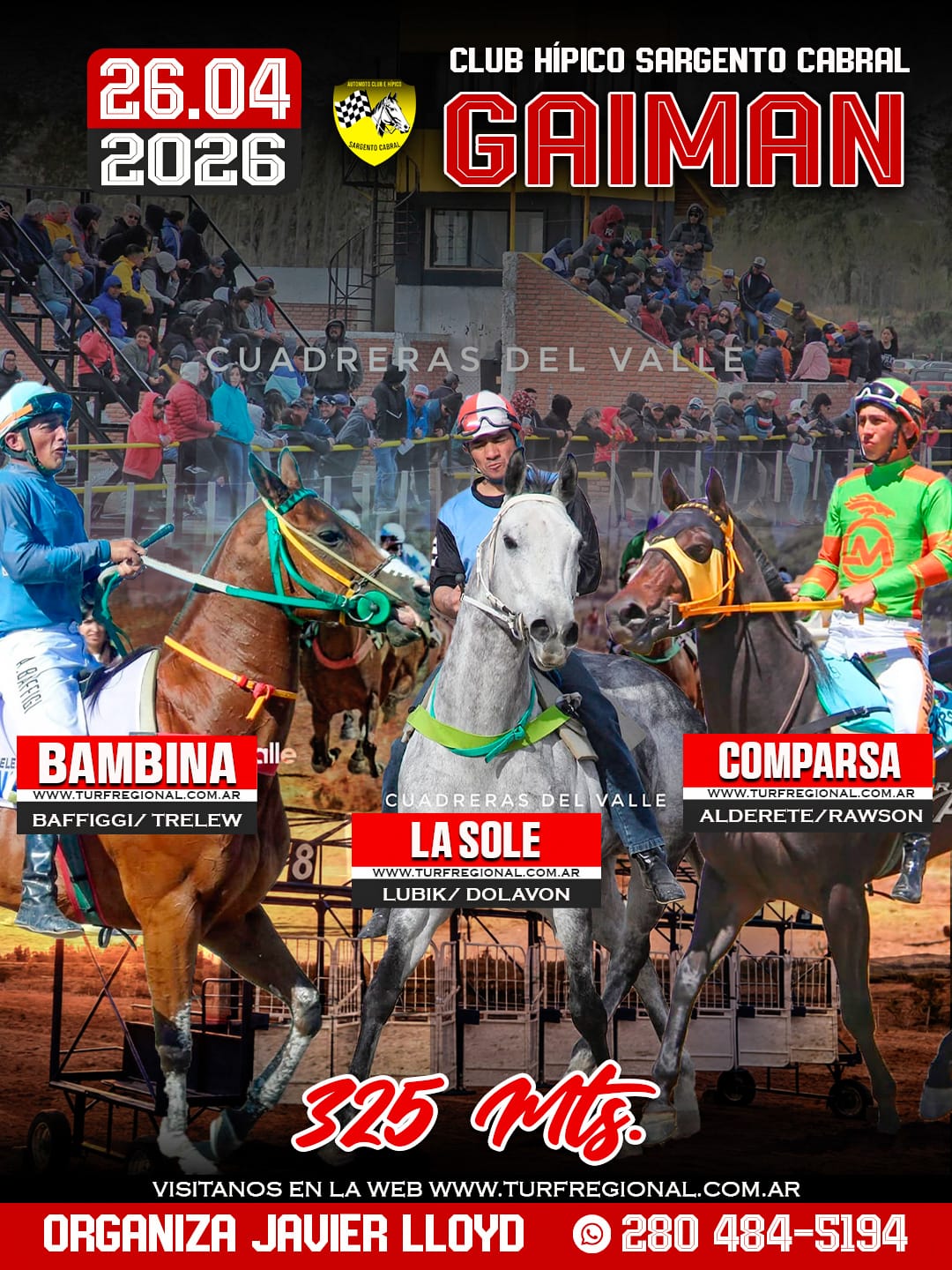 Todos los adelantos para la jornada de este domingo 26 de abril en el Club Hípico Sargento Cabral GAIMAN, provincia de Chubut. Un especial sobre los 310 metros en donde se enfrentarán Lola Jess, Peluchin y Jamaica Jess. En la organización Javier Lloyd. CONTACTO: 280 484-5194