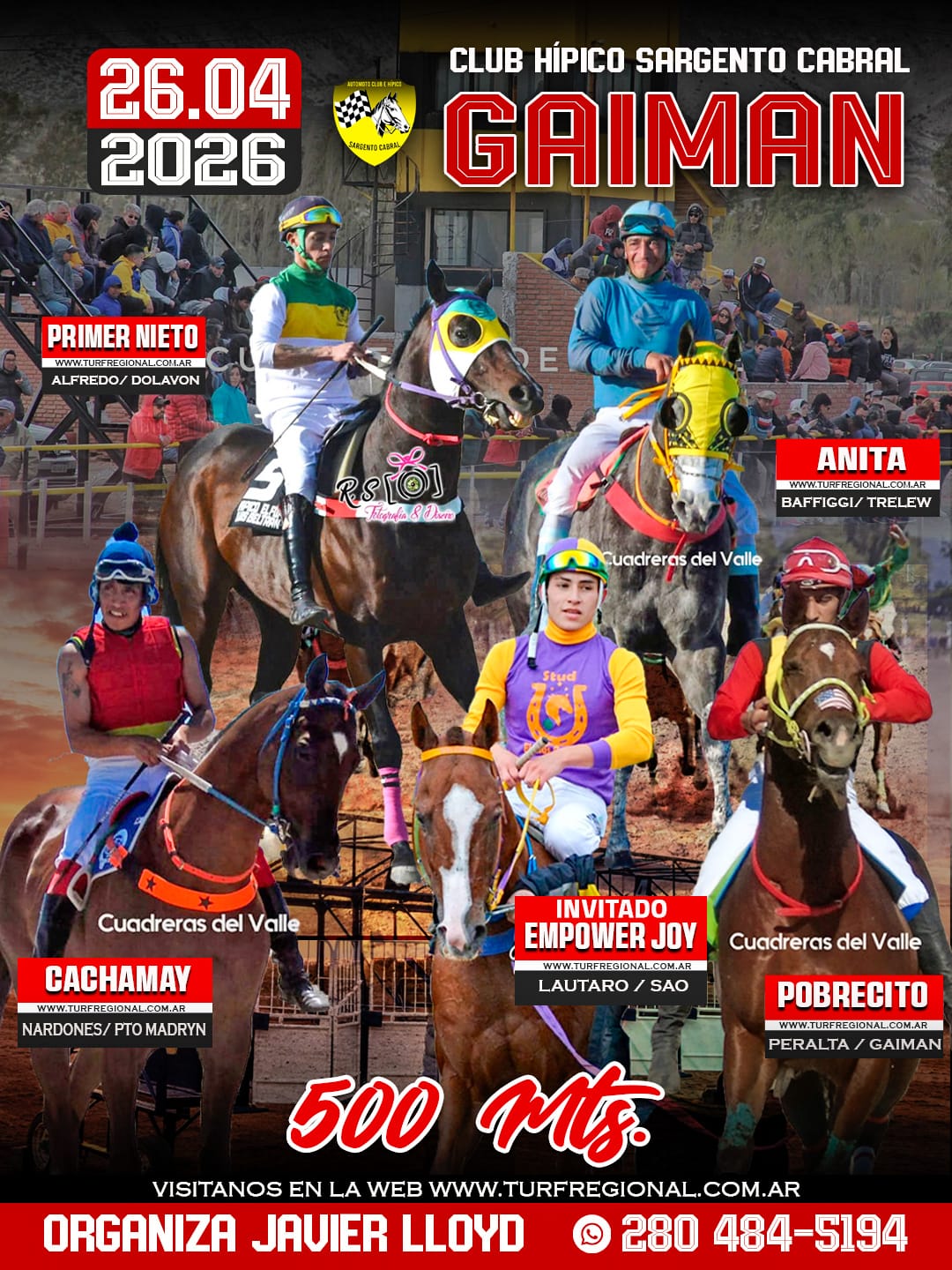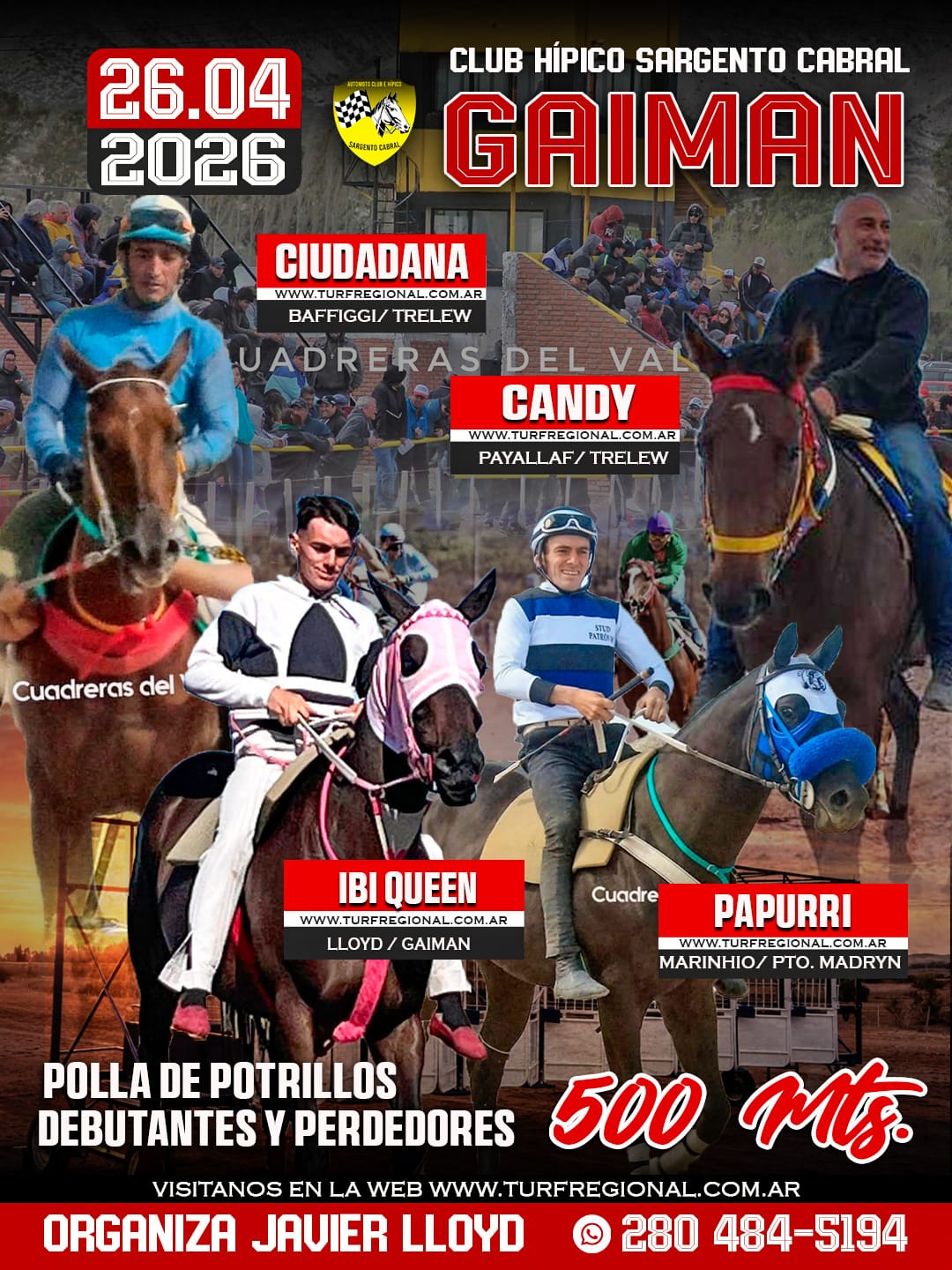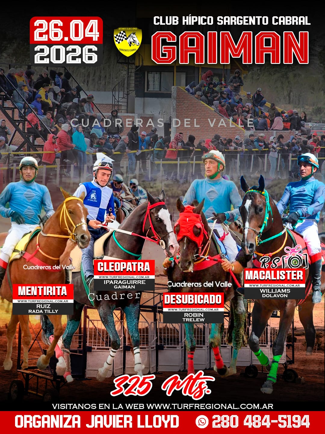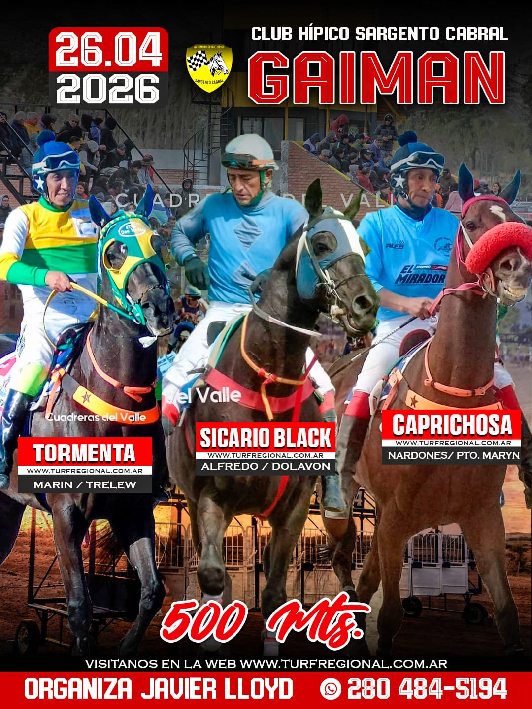 Todos los adelantos para la jornada de este domingo 26 de abril en el Club Hípico Sargento Cabral GAIMAN, provincia de Chubut. Un especial sobre los 310 metros en donde se enfrentarán Lola Jess, Peluchin y Jamaica Jess. En la organización Javier Lloyd. CONTACTO: 280 484-5194