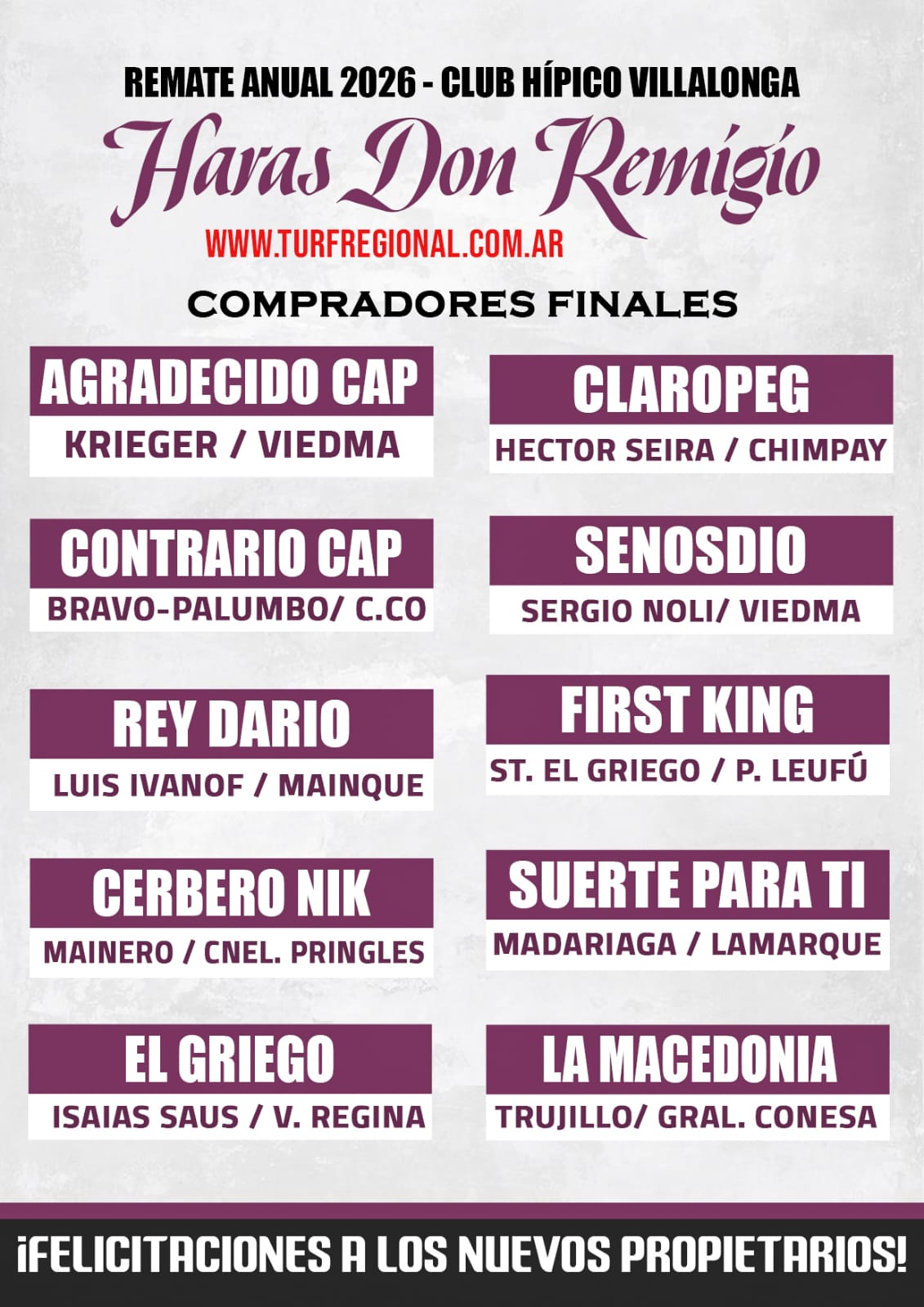 El mejor precio del remate fue para Rey Darío (Captivating Cat con madre Sidney’s Candy) por el que se pagaron $ 24.000.000. En preferencias lo siguieron Contrario Cap y Agradecido Cap completando el podio. Se vendieron todos los productos y la buena noticia es que la polla 2027 tendrá distintas procedencias en sus invitados: Viedma, Cutral Co, Mainque, Coronel Pringles, Chimpay, Picun Leufú, Lamarque y General Conesa. Promediando la tarde dominguera se corrió la Polla de Potrillos Haras Don Remigio y allí la victoria fue para Buffet Cap, propiedad de Daniel Madariaga, preparada “al óleo” por Ariel Zubiri y conducida con serenidad por Gastón Sáez. Ganó con solvencia la hija de Captivating Cat con madre Van Nistelrooy con claras ventajas sobre su hermano paterno Macana Cap (de Rigoberto Díaz que sigue pegando en el poste en la polla) y tercero Corsario Nik del “Nico” Becerra de Villa Manzano y que alimenta esperanzas. Con la logística de Sandro Hocquart, la preparación de los productos a cargo de Fernando Abella y Ramón Delgado, la cabaña de Marcelo Houriet y Silvio Abella pasó nuevamente por Villalonga y cumplió con todas las expectativas. Nos vemos en abril 2027!!