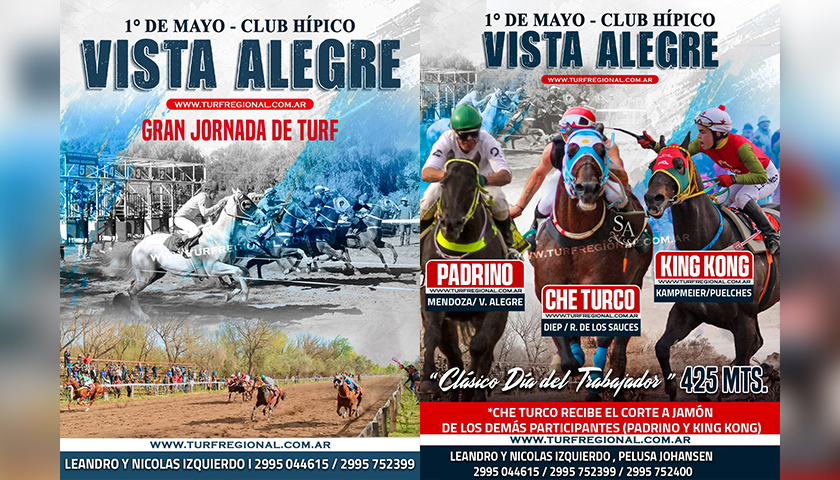 El programa para el Club Hípico de Zapala para este 16 de diciembre, conformado por la dupla Carlos Fernández y Marcelo Huenul. En la prueba central, se enfrentan tres productos Tres Haras: Armas Checho, Santino (Armas Esquinado) y ER Cardenal. Serán 15 carreras en total desde las 9 de la mañana.