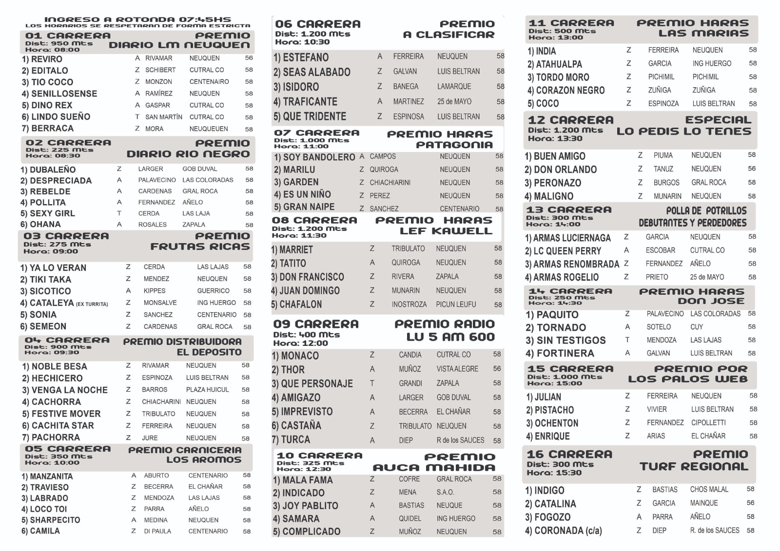 Se corre en el Hipódromo de Neuquén la última del calendario 2025. Entre los 24 cotejos bajo la organización de Alexis Bucarey, la prueba central será el Clásico Clausura y el Gran Clásico Cierre de temporada. Aquí el programa oficial.