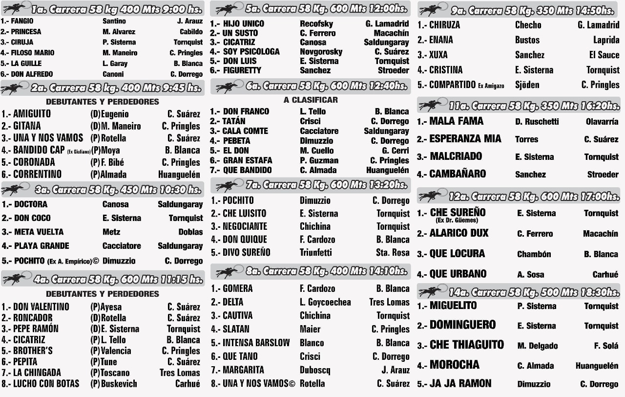 Segunda 400 Debutantes y Perdedores 1- UNA Y NOS VAMOS Rotella/C.Suarez 2- Coronada/C.Pringles 3- Correntino/Huanguelen. Tambièn corrieron Amiguito y Bandido Cap. Borrado: Gitana. Fallo: 3 cpos. Jockey: Martin Gonzalez. Sport $ 4.