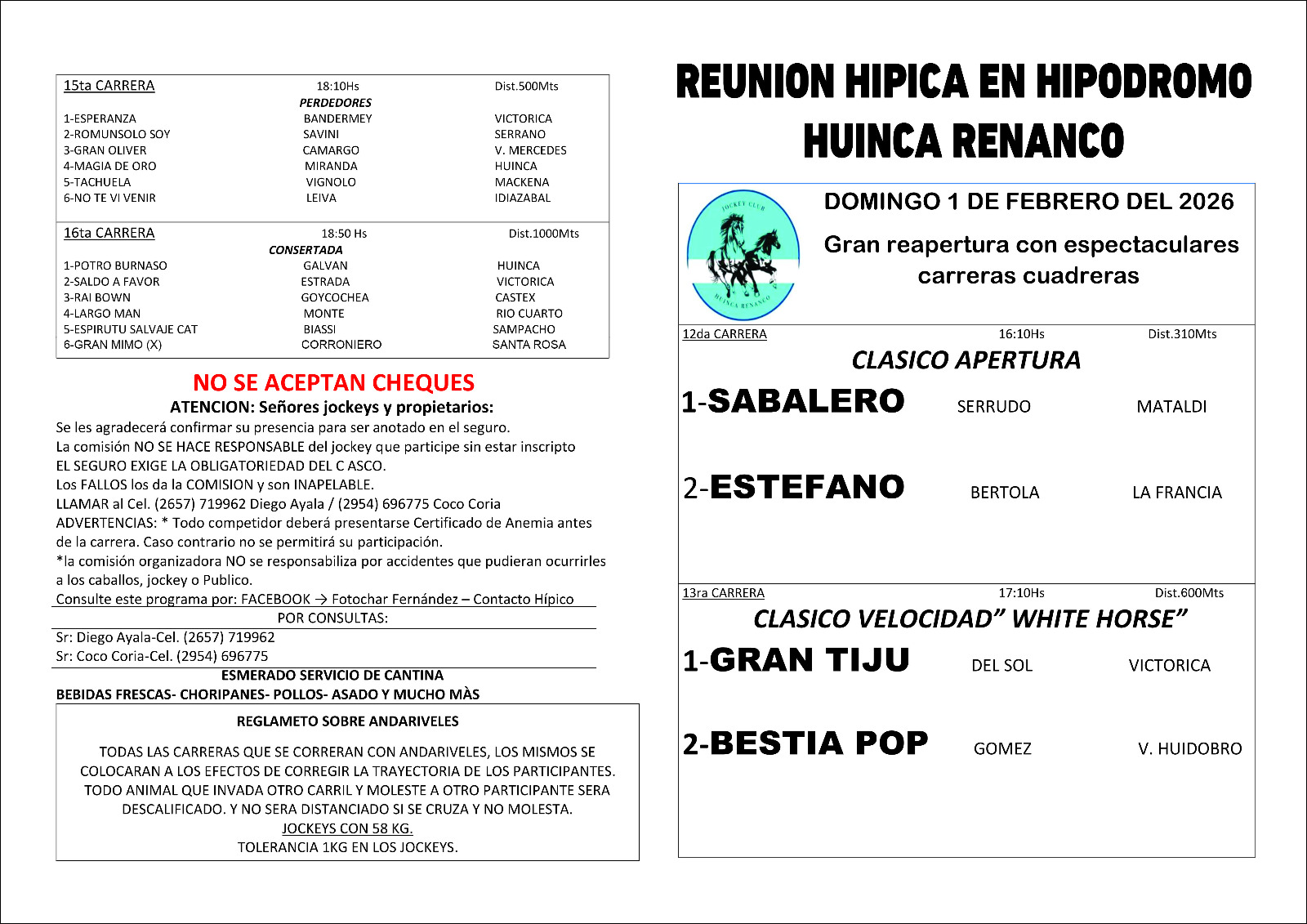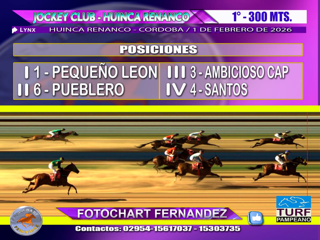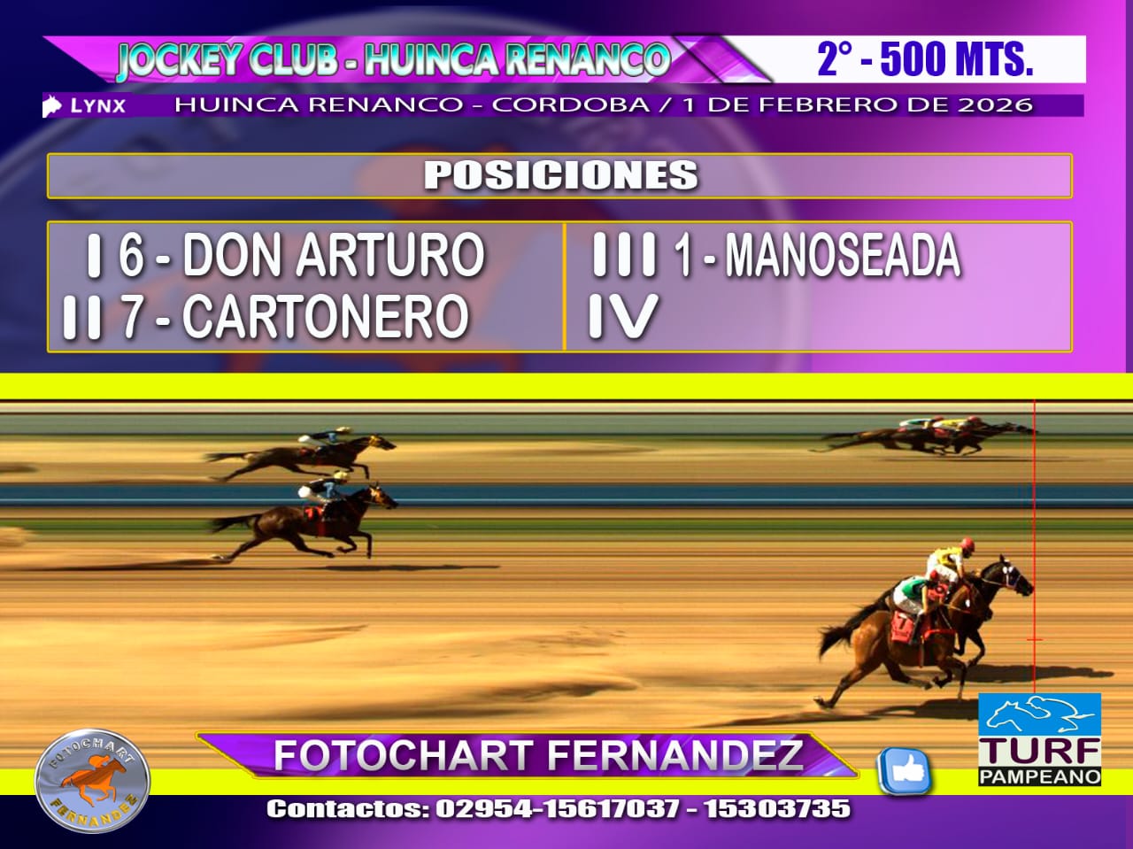 Este domingo 1 de febrero vuelve a abrir sus puertas el Jockey Club HUINCA RENANCÓ, provincia de Cordoba. El programa a cargo de la dupla Diego Ayala – Coco Coria está formado por 16 carreras, entre ellas el Clásico Apertura y el Clásico Velocidad “White Horse”. Con el Bono (que también sirve como entrada) participas por importantes premios. Aquí los resultados de la jornada, gentileza del equipo de Fotochart Fernandez.