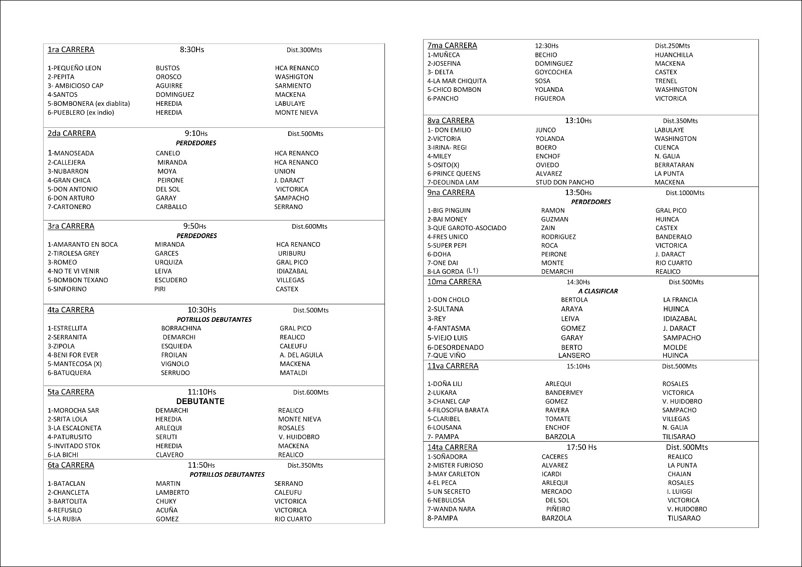 Primera carrera, distancia 300 metros: 1) PEQUEÑO LEON (Bustos/ Huinca Renancó) 2) Pueblero (Heredia/ Monte Nievas) 3) Ambicioso Cap (Aguirre/ Sarmientos) 3) Santos (Dominguez/ V. Mackena) Jockey: Tomas Villegas.