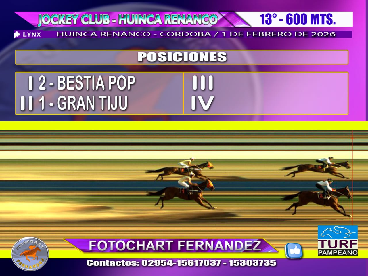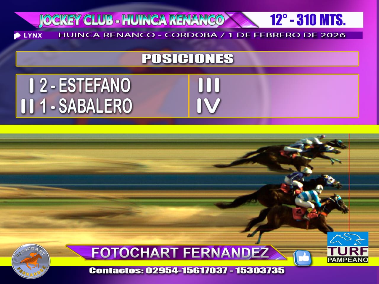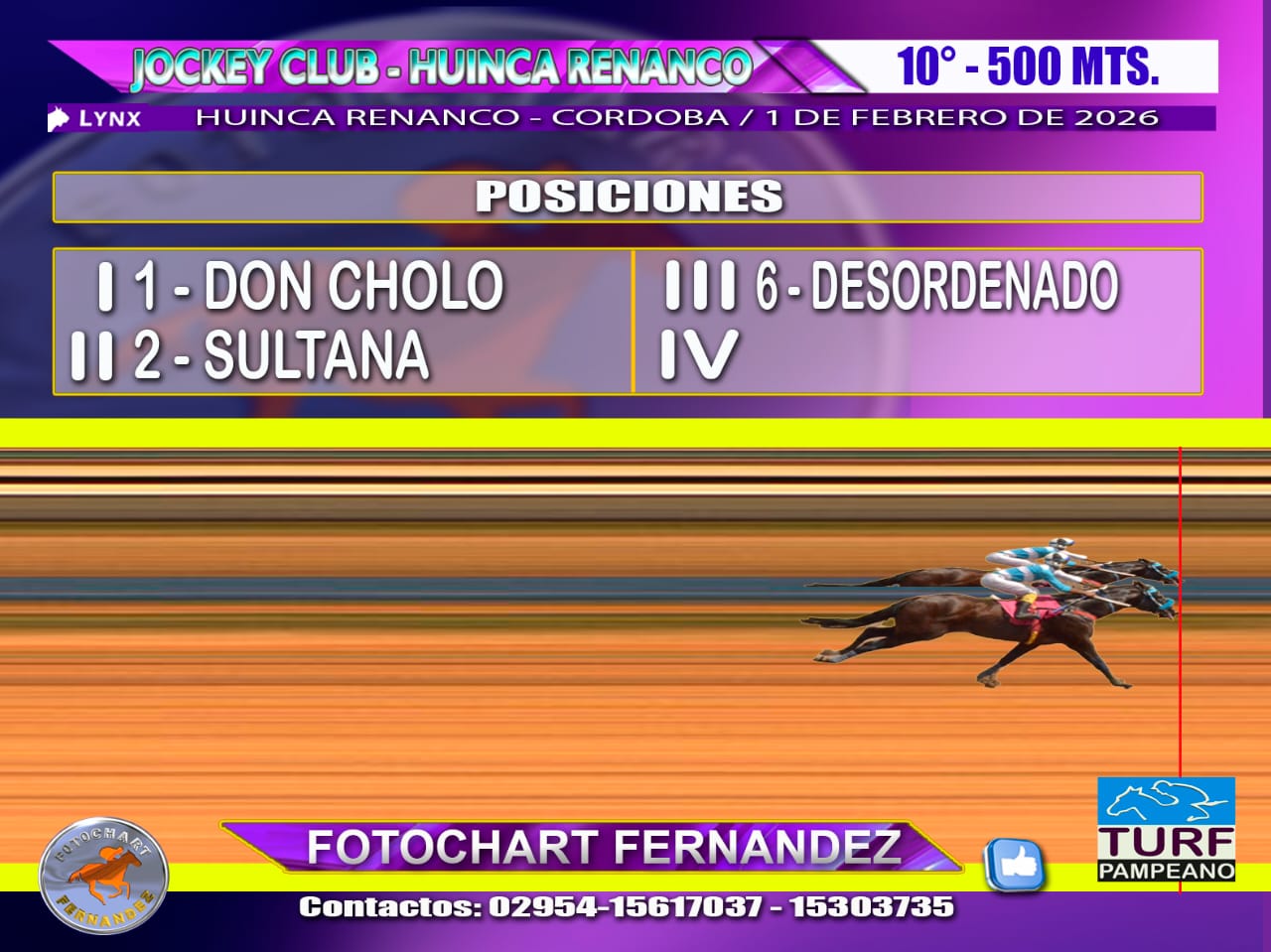 Este domingo 1 de febrero vuelve a abrir sus puertas el Jockey Club HUINCA RENANCÓ, provincia de Cordoba. El programa a cargo de la dupla Diego Ayala – Coco Coria está formado por 16 carreras, entre ellas el Clásico Apertura y el Clásico Velocidad “White Horse”. Con el Bono (que también sirve como entrada) participas por importantes premios. Aquí los resultados de la jornada, gentileza del equipo de Fotochart Fernandez.