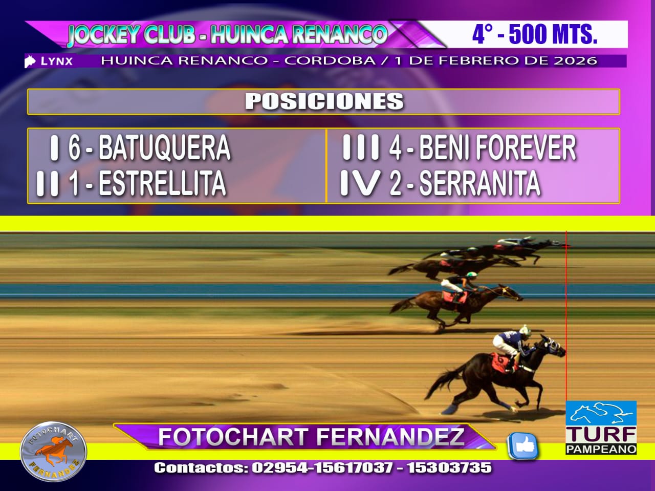 Cuarta carrera, Potrillos Debutantes, distancia 500 metros: 1) BATUQUERA (Serrudo/ Mataldi) 2) Estrellita (Borrachina/ Gral. Pico) 3) Beni for ver (Froilan/ A. del Aguila) 4) Serranita (Dermarchi/ Realicó) Jockey Cristian Ávalos.