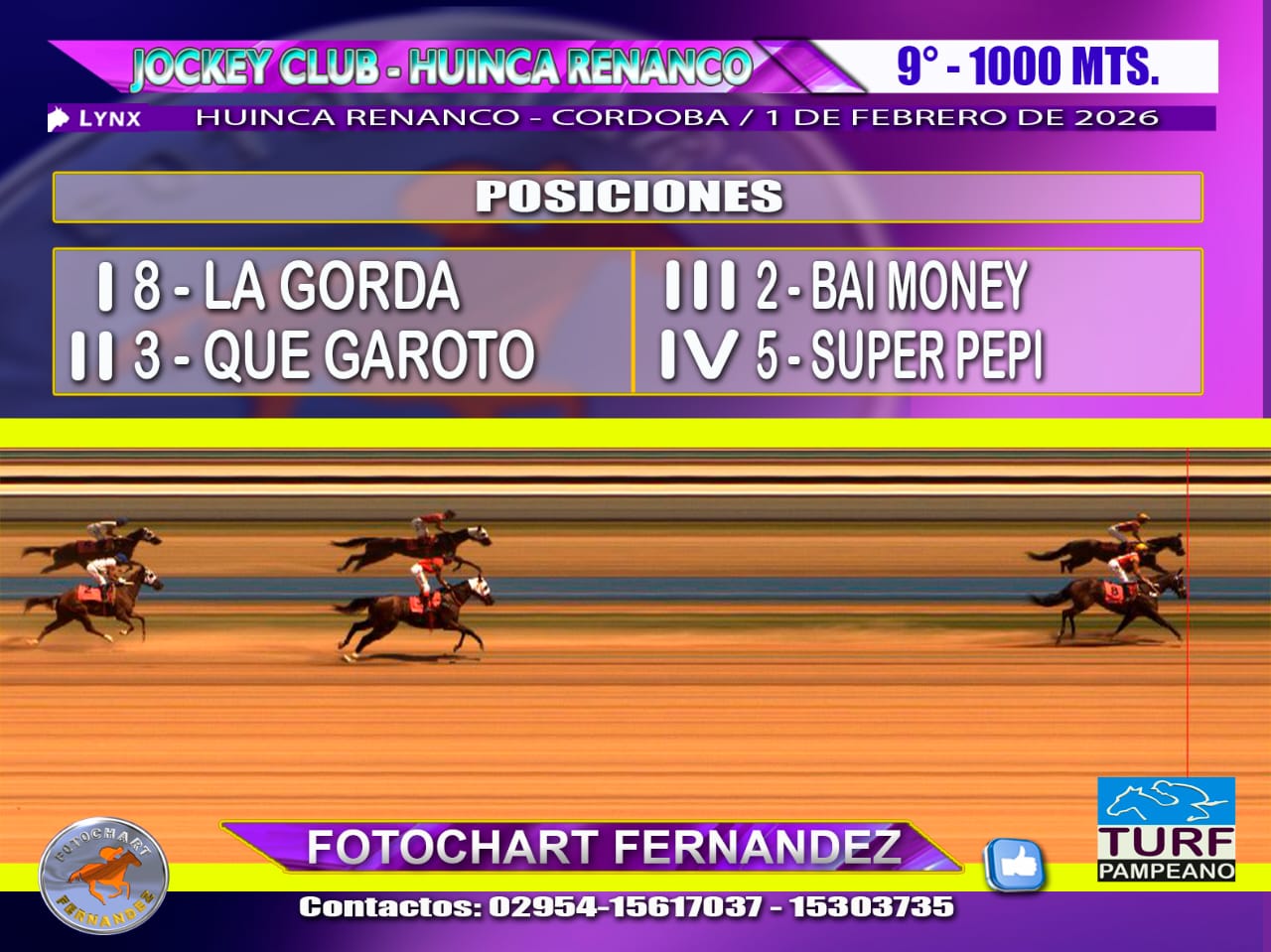 Novena, Perdedores, distancia 1000 metros: 1) LA GORDA (DEMARCHI/ REALICÓ) 2) Que garoto (Zain/ Edo. Castex) 3) Bye Money (Guzman/ Huinca Renancó) 4) Super Pepi (Roca/ Victorica)
