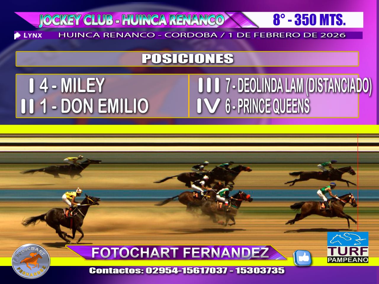 Octava carrera, distancia 350 metros: 1) MILEY (Enchof/ Nueva Galia) 2) Don Emilio (Junco/ Laboulaye) 3) Deolinda Lam (Stud Don Pancho/ V. Mackena) 4) Prince Queens (Álvarez/ La Punta) . Jockey Tomás Villegas