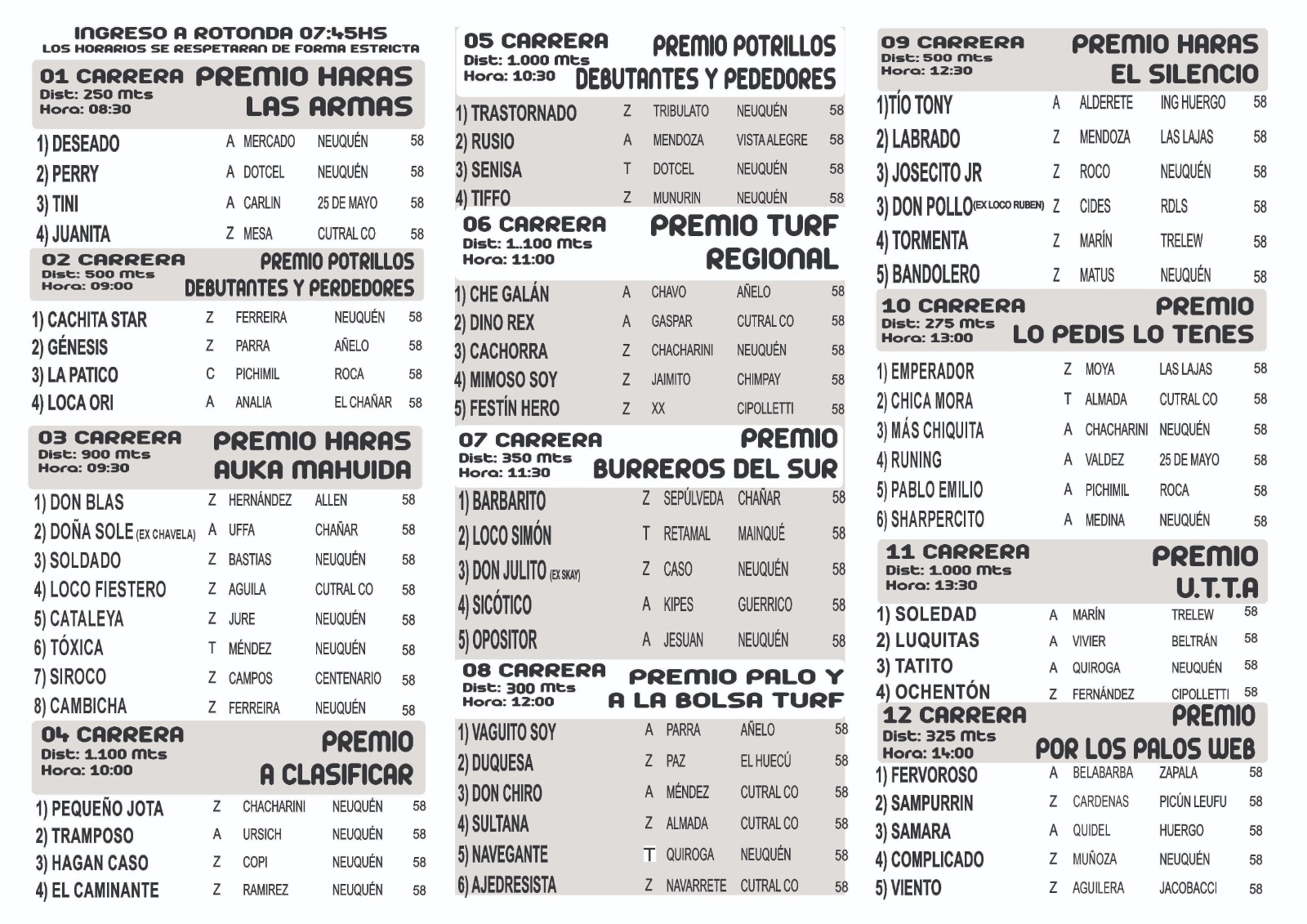 Octava carrera, Premio Palo y a la Bolsa Turf, distancia 300 metros: 1) SULTANA (Almada/ Cutral Co) 2) Ajedrecista (Navarrete/ Cutral Co) 3) Vaguito soy (Parra/ Añelo) 4) Don Chiro (Mendez/ Cutral Co) 5) Duquesa (Paz/ El Huecu) Jockey: Nicolas Camera. N/C: Navegante.