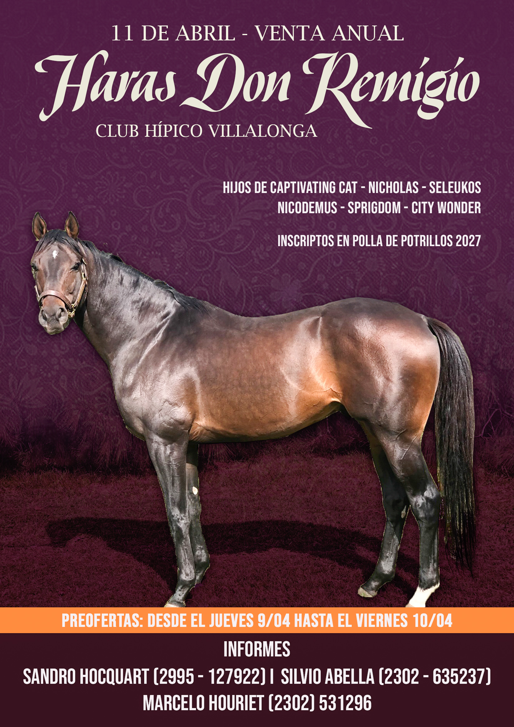 Haras Don Remigio (Mataldi, Córdoba) estará nuevamente presente en el Club Hípico de Villalonga (Provincia de Bs As) el 11 y 12 de abril con remate de productos y la tradicional Polla de Potrillos con los ejemplares vendidos el año pasado. El sábado 11 luego de un almuerzo hará su tradicional remate de manera PRESENCIAL aunque habrá pre ofertas desde el jueves 9/04 hasta el viernes 10/04 inclusive, con importantes beneficios para el ganador de la misma. Por su parte, el domingo se correrá la Gran Polla de Potrillos sobre 600 metros en el marco de la jornada de carreras que preparan Federico Ciccone y Rubén Centeno. CONSULTAS: Sandro Hocquart (299) 5 127 922 – Silvio Abella (2302) 635237 Marcelo Houriet (2302) 531296 – Federico Ciccone (291) 413 7587 – Ruben Centeno (2920) 60 8836
