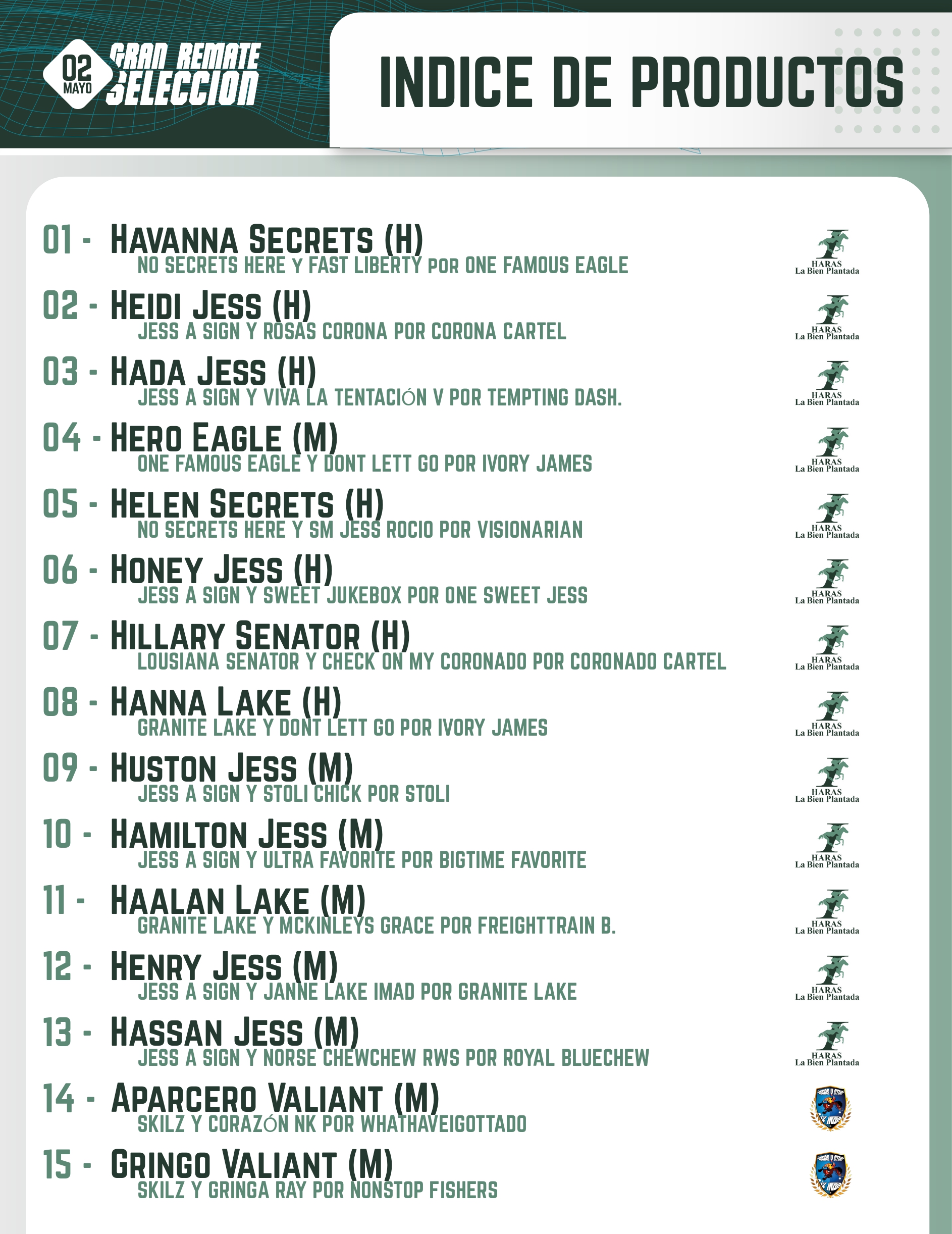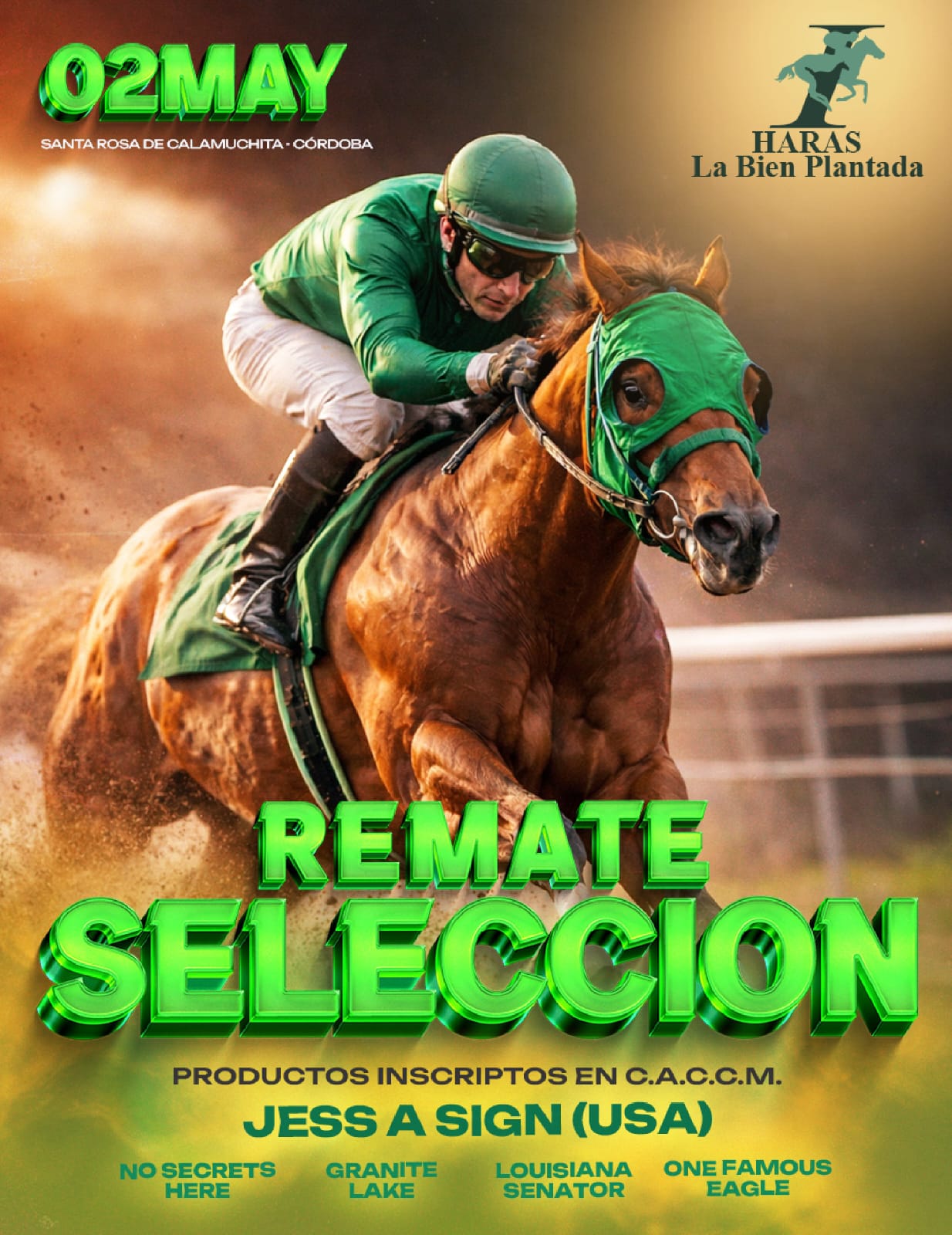 Subirán al ring de ventas 15 productos hijos de JESS A SING (USA), GRANITE LAKE, LOUISIANA SENATOR y ONE FAMOUS EAGLE, inscriptos en CACCM (Asoc. Criadores de Cuarto de Milla) y en Polla de Potrillos a disputarse en 2027. Aquí el Catálogo